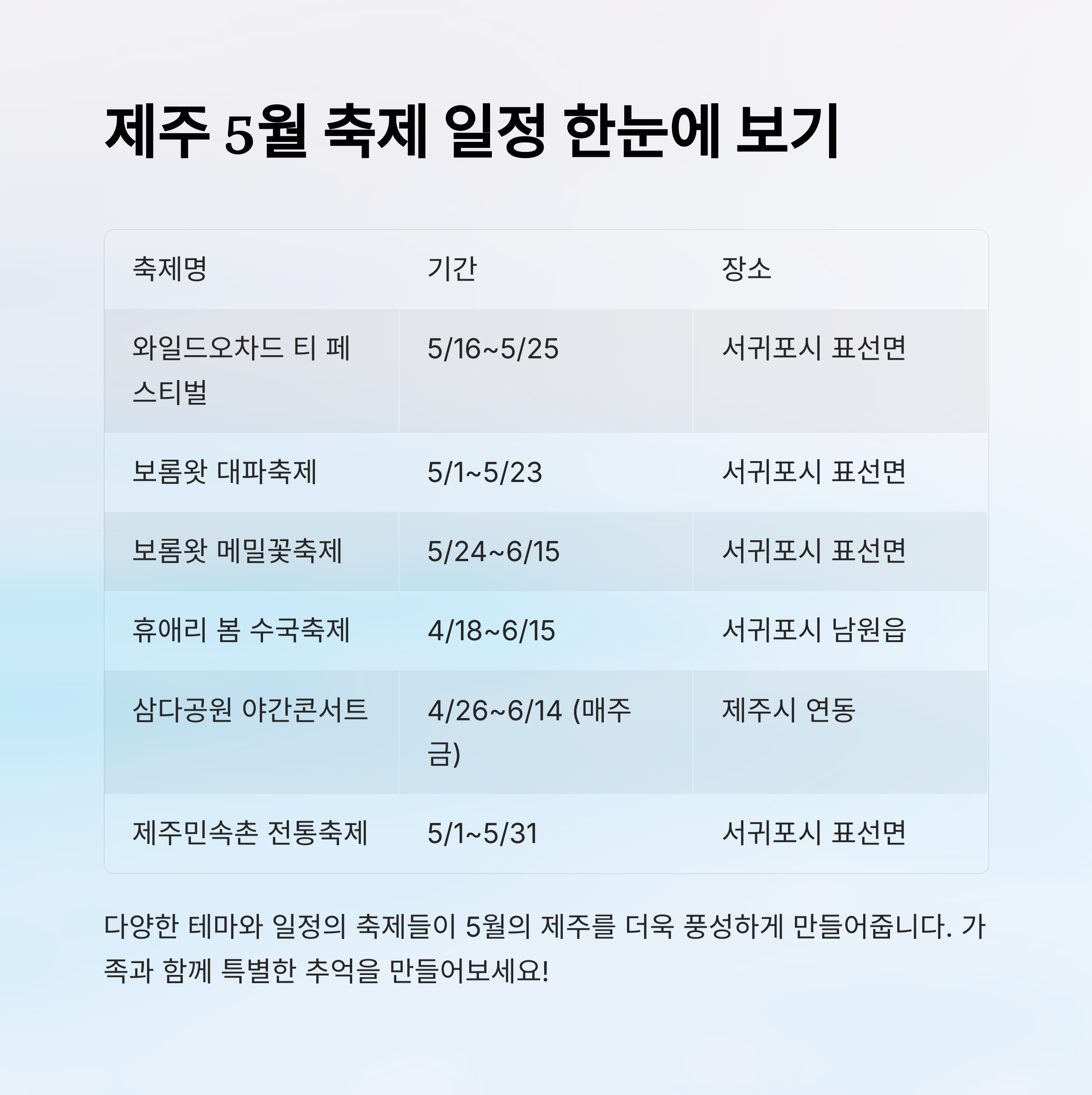 제주에서 열리는 2025년 5월 주요 축제를 한눈에 비교할 수 있도록 표로 정리해볼게요. 일정, 장소, 주요 프로그램을 간단하게 확인할 수 있어서 여행 계획 세우는 데 도움이 될 거예요.