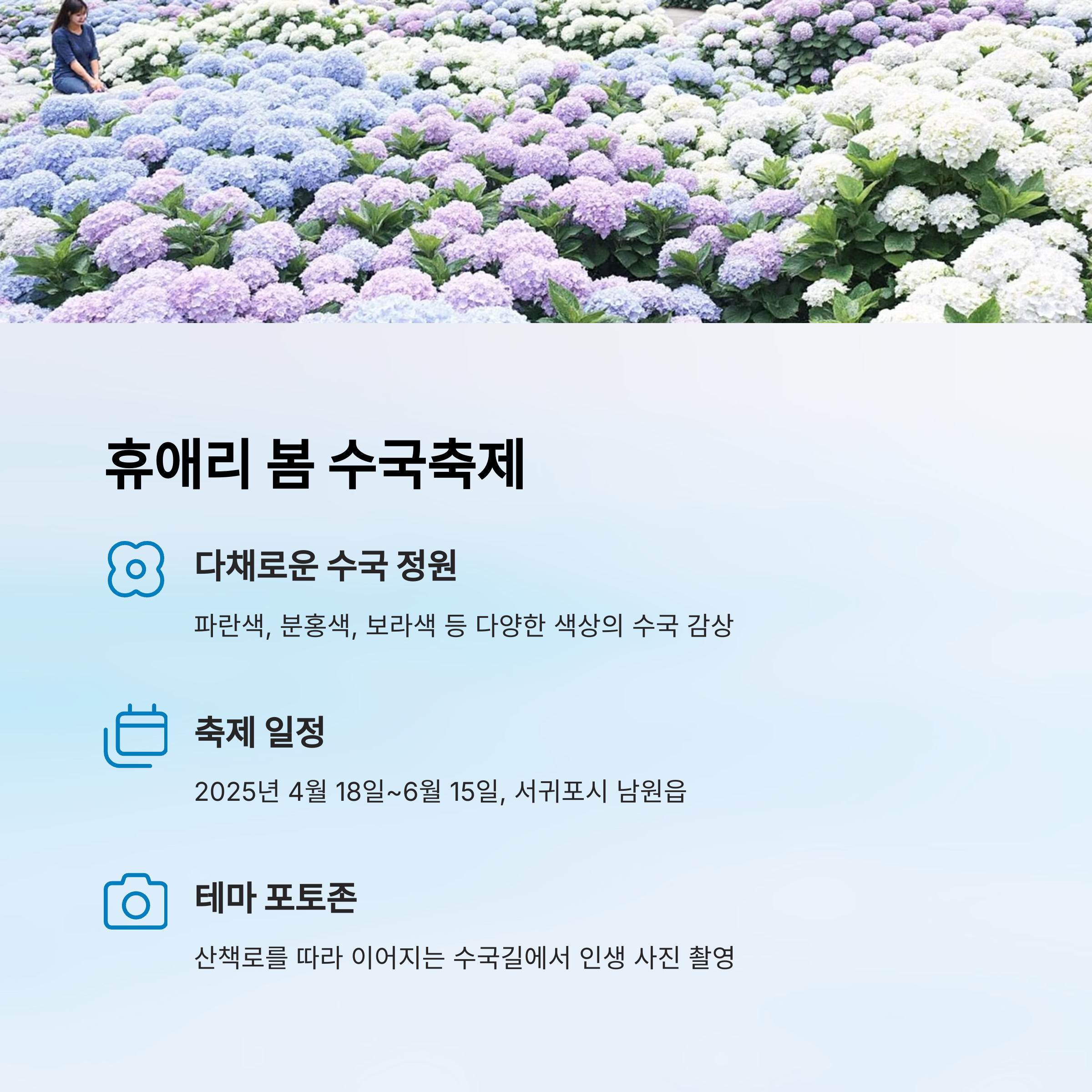 | 휴애리 봄 수국축제 | 4/18~6/15 | 서귀포시 남원읍 | 수국 산책길, 온실정원, 포토존 |
