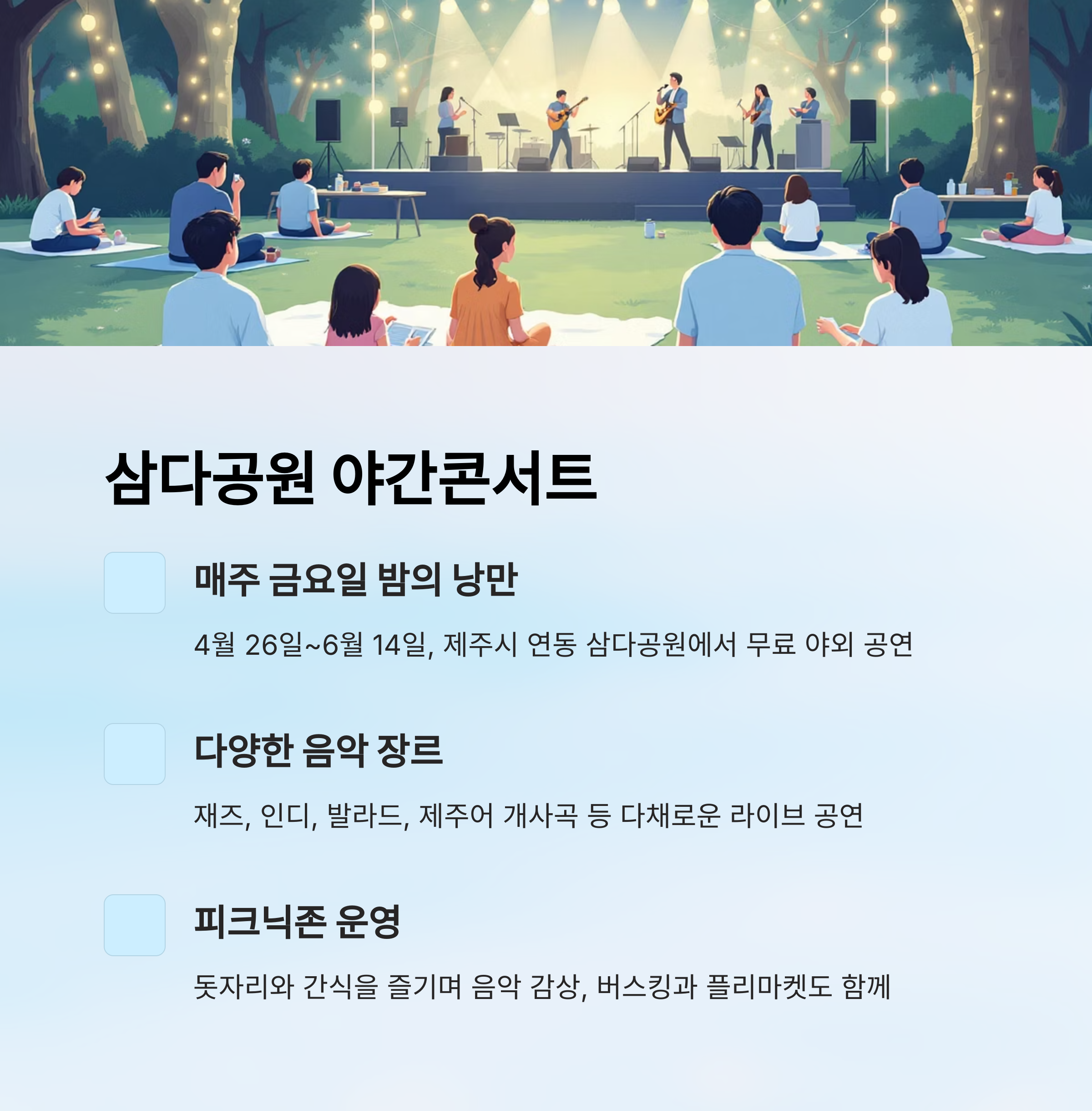 | 삼다공원 야간콘서트 | 4/26~6/14 (매주 금) | 제주시 연동 | 라이브 공연, 피크닉존, 부대 체험 |