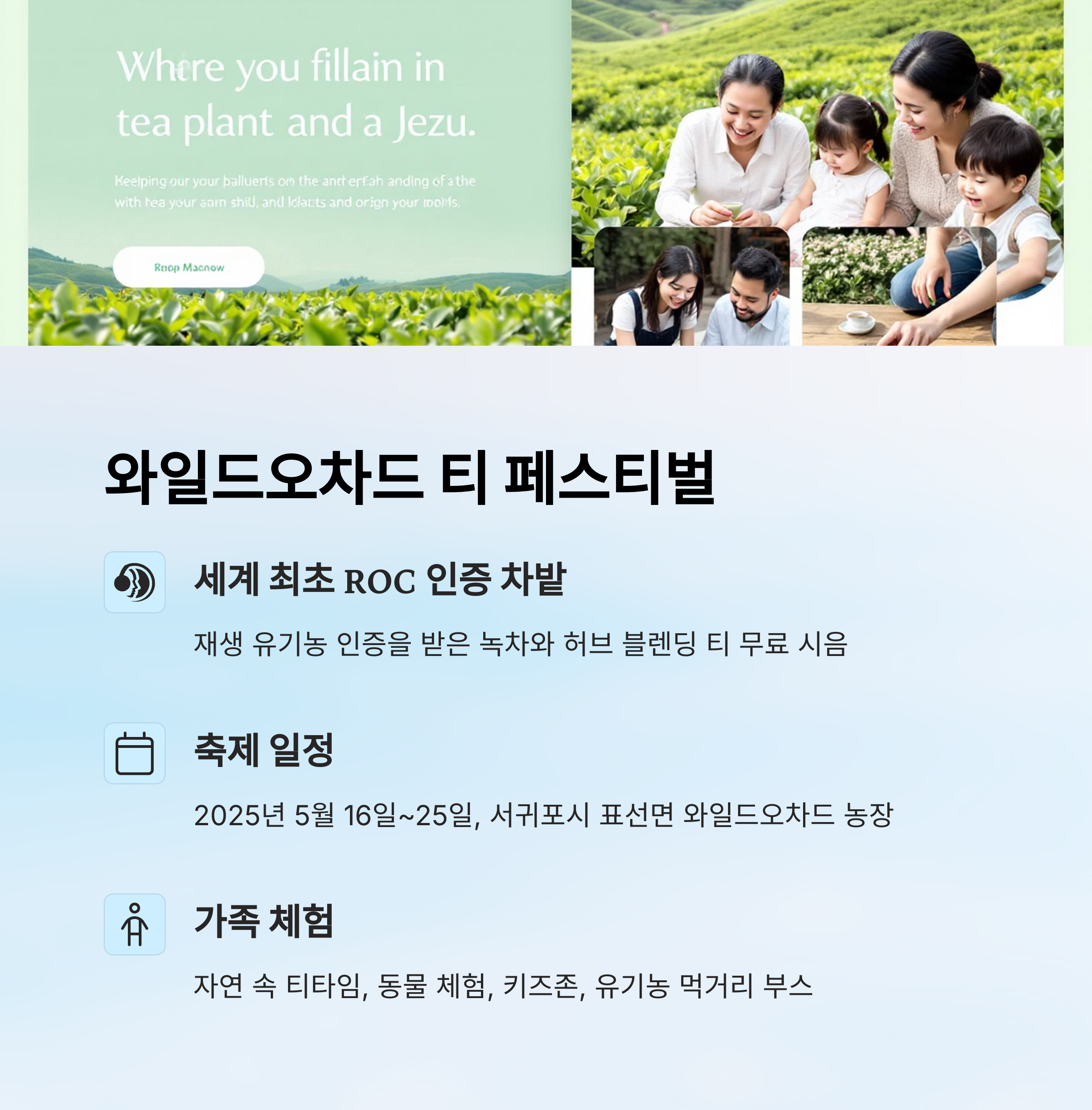 | 와일드오차드 티 페스티벌 | 5/16~5/25 | 서귀포시 표선면 | 차 시음, 티 클래스, 키즈존, 차밭 투어 |