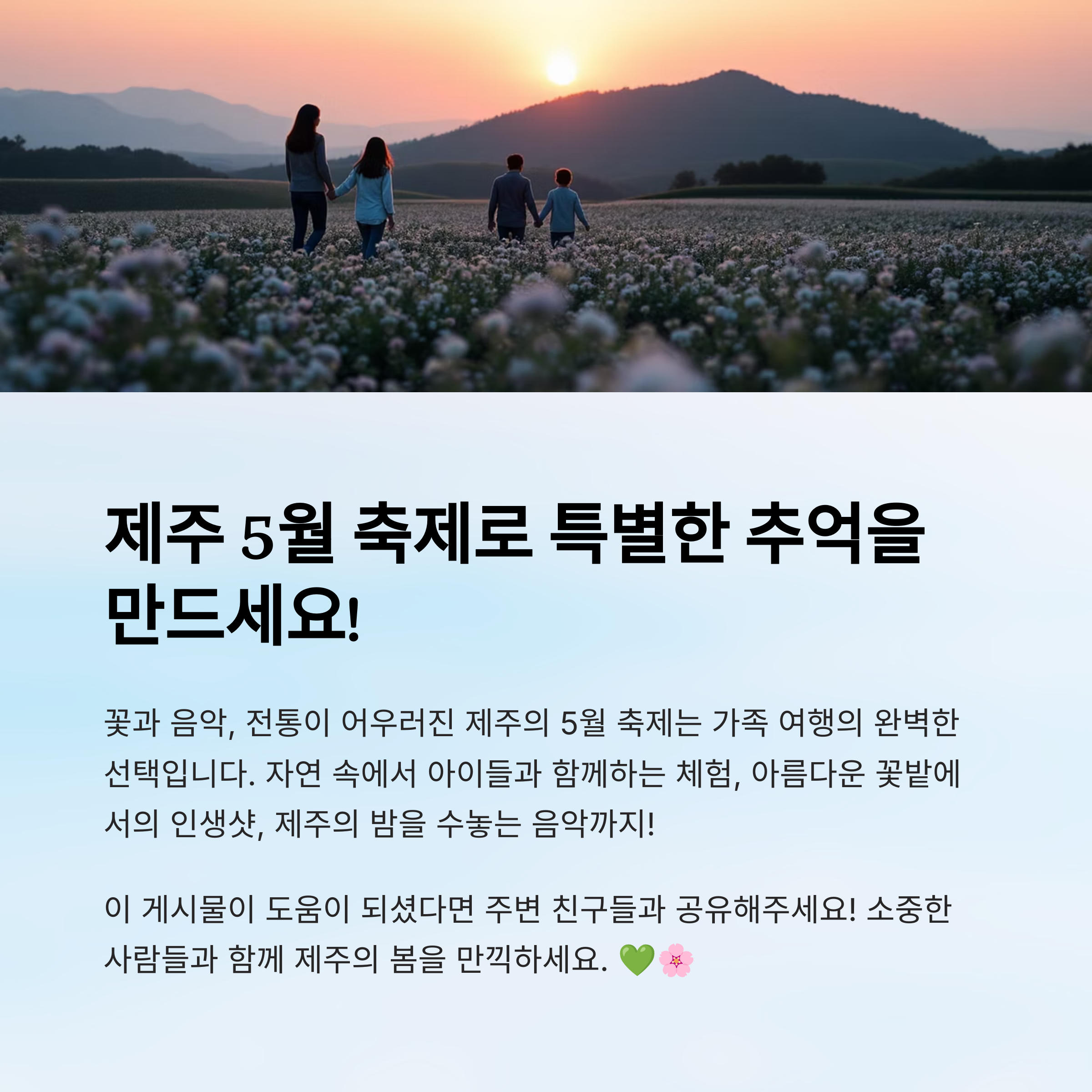 제주는 5월이 되면 형형색색의 꽃과 향기, 따뜻한 햇살 아래 펼쳐지는 다채로운 축제로 활기를 더해요. 자연과 예술, 체험, 전통이 어우러지는 이 계절, 온 가족이 함께 제주에서만 경험할 수 있는 특별한 축제들이 기다리고 있답니다.