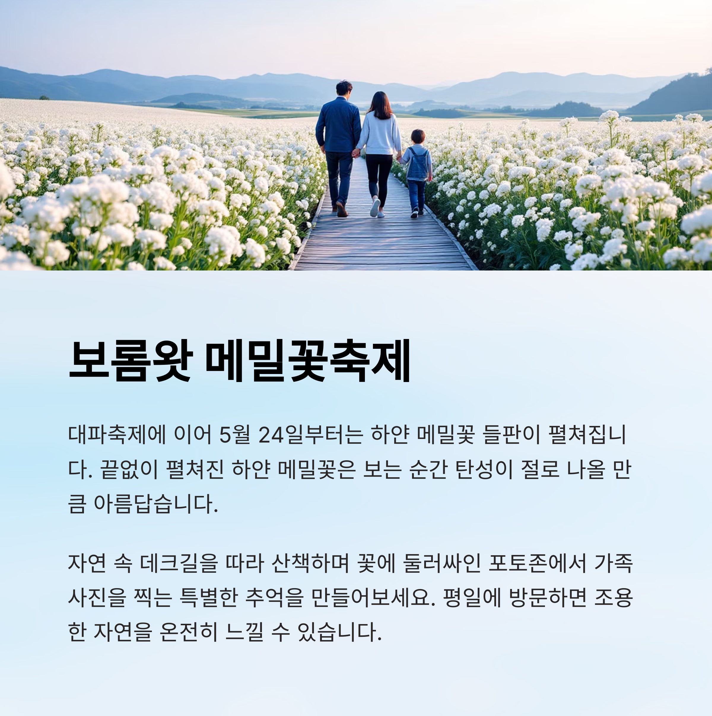 | 보롬왓 메밀꽃축제 | 5/24 ~ 6/15 | 자연 산책, 포토 체험 | 하얀 메밀꽃 들판, 나무 데크길 |