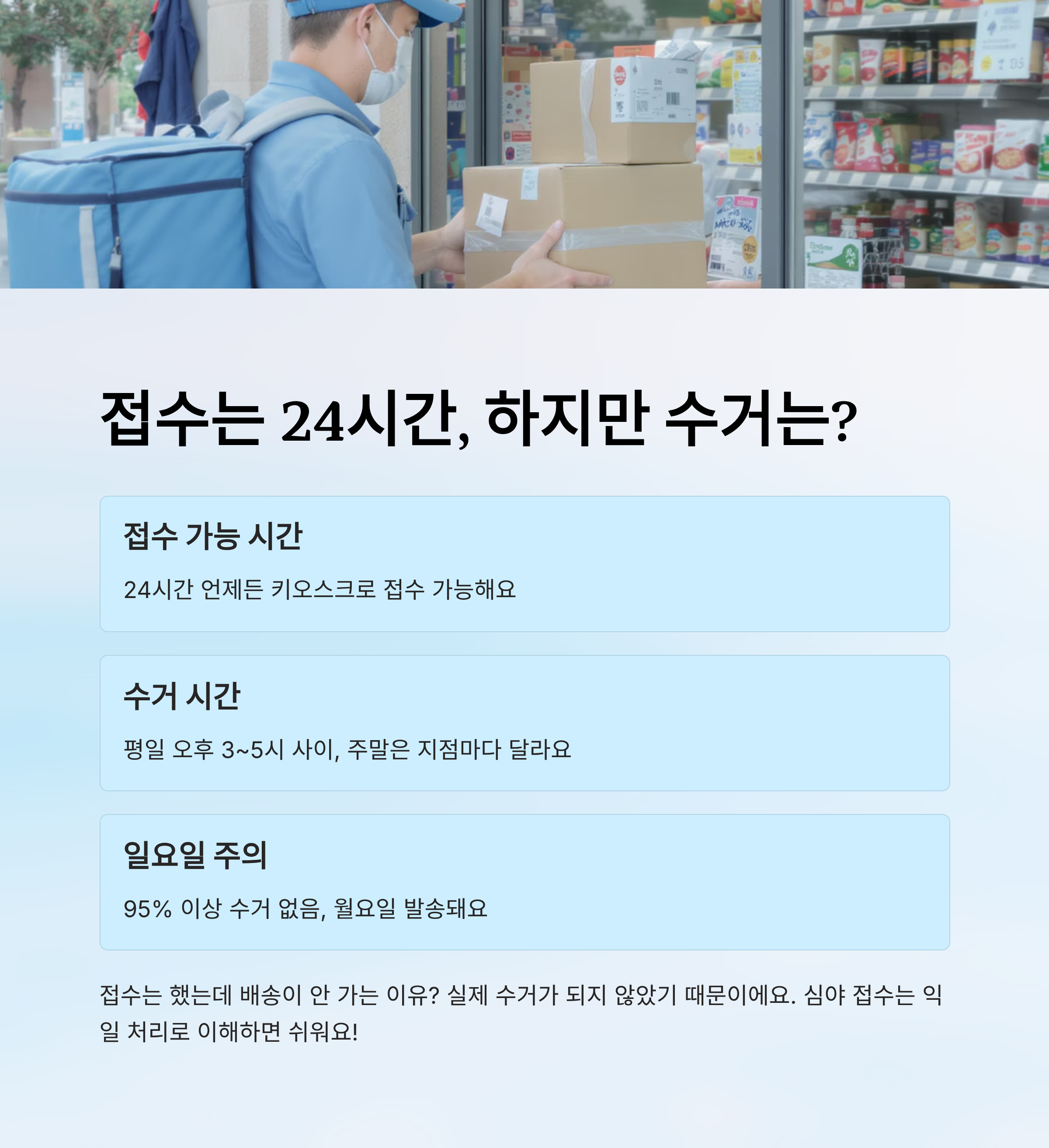 내가 생각했을 때 가장 헷갈리는 건 ‘접수는 했는데 왜 배송이 안 가지?’라는 부분이에요. 이건 실제 수거가 되지 않았기 때문인데요, 특히 심야 시간에 접수하면 다음날 기사 수거 시까지 그대로 매장에 보관돼요. 그런 점을 감안해서 배송일정을 계산해야 해요.