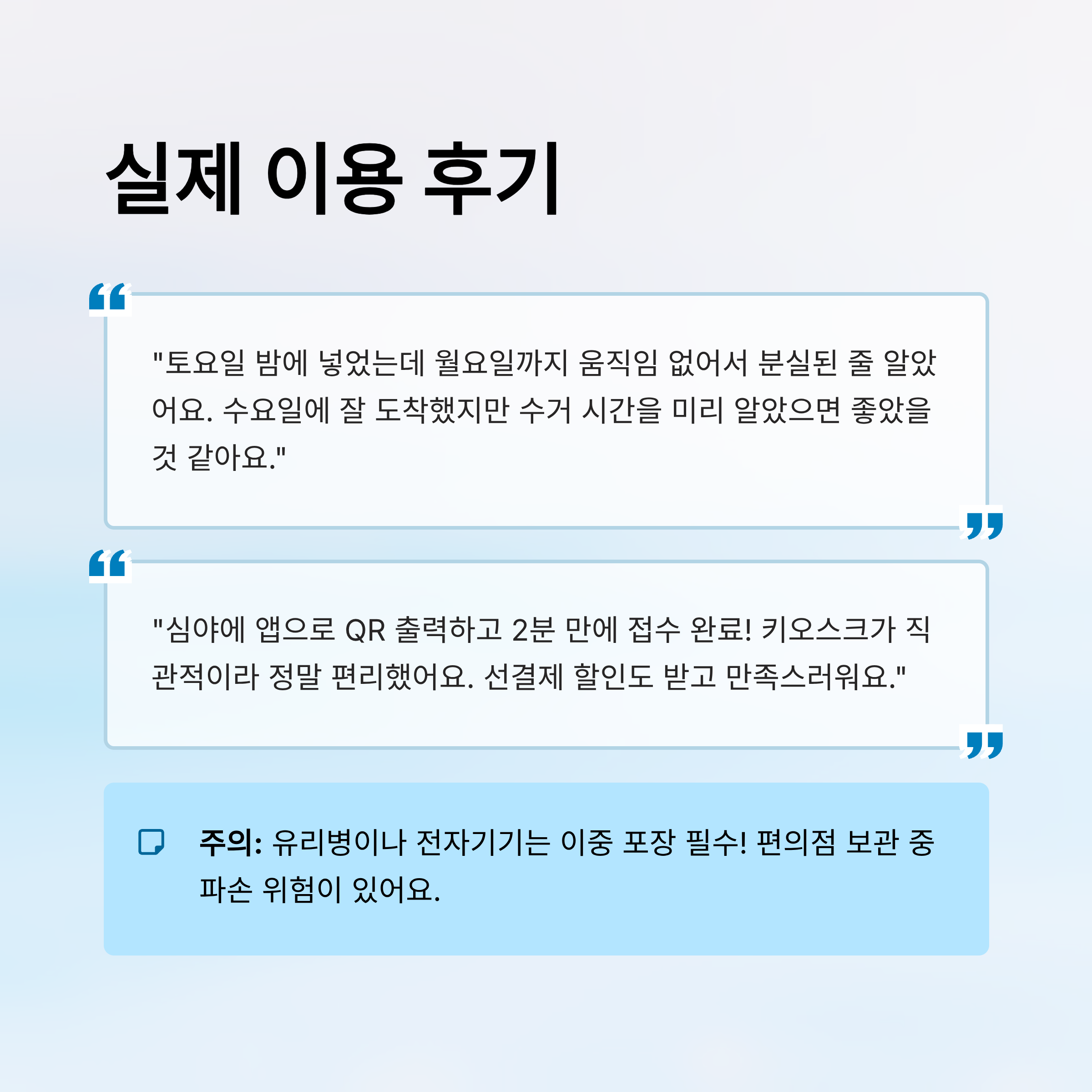 또 다른 이용자는 “심야 시간이라 걱정했지만, 앱에서 QR로 바로 송장 출력하고 접수까지 2분도 안 걸렸다”는 긍정적인 후기를 남겼어요. 요즘 키오스크가 직관적이라 익숙해지면 정말 편리하답니다.