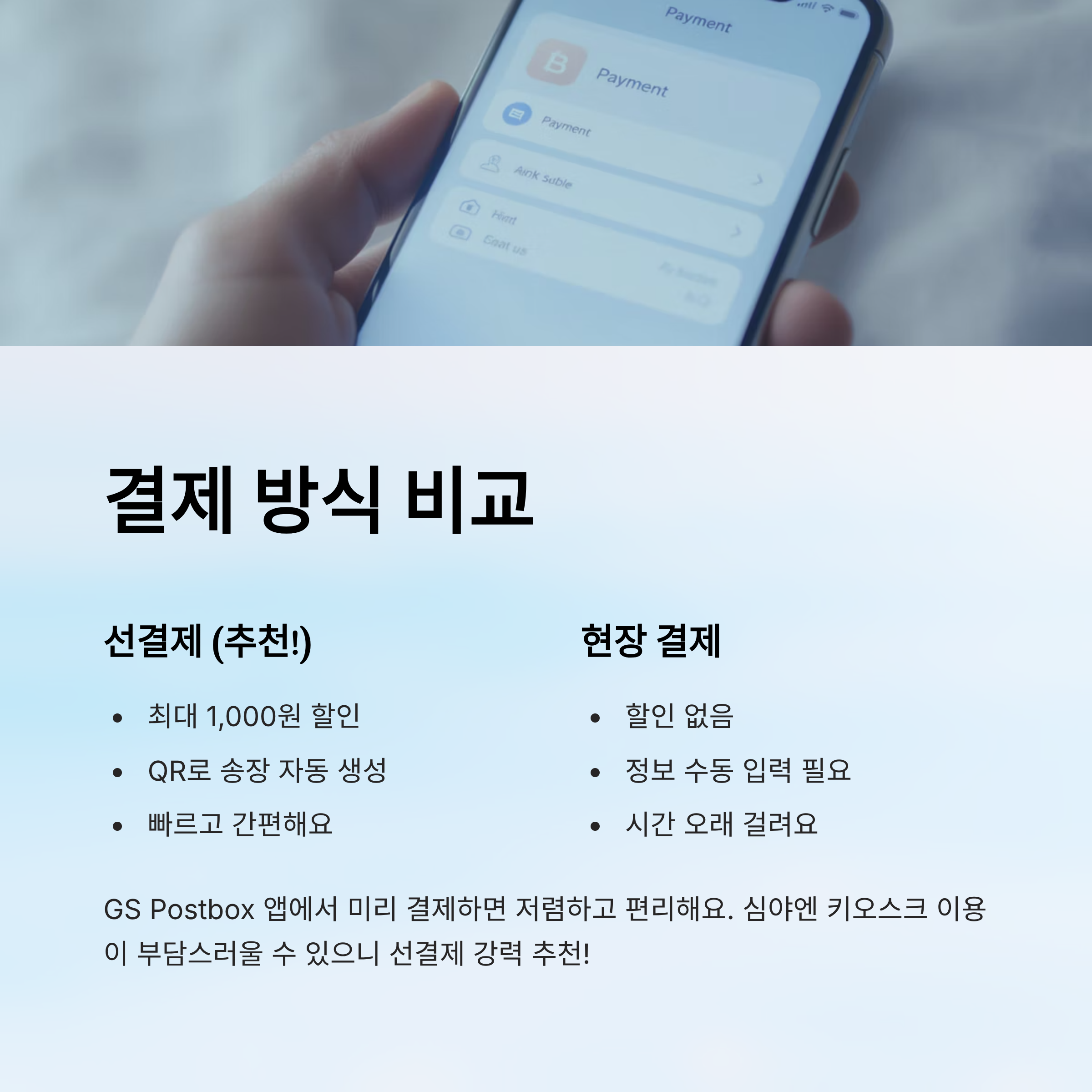 | 결제 위치 | GS Postbox 앱 또는 웹 | 편의점 키오스크 |