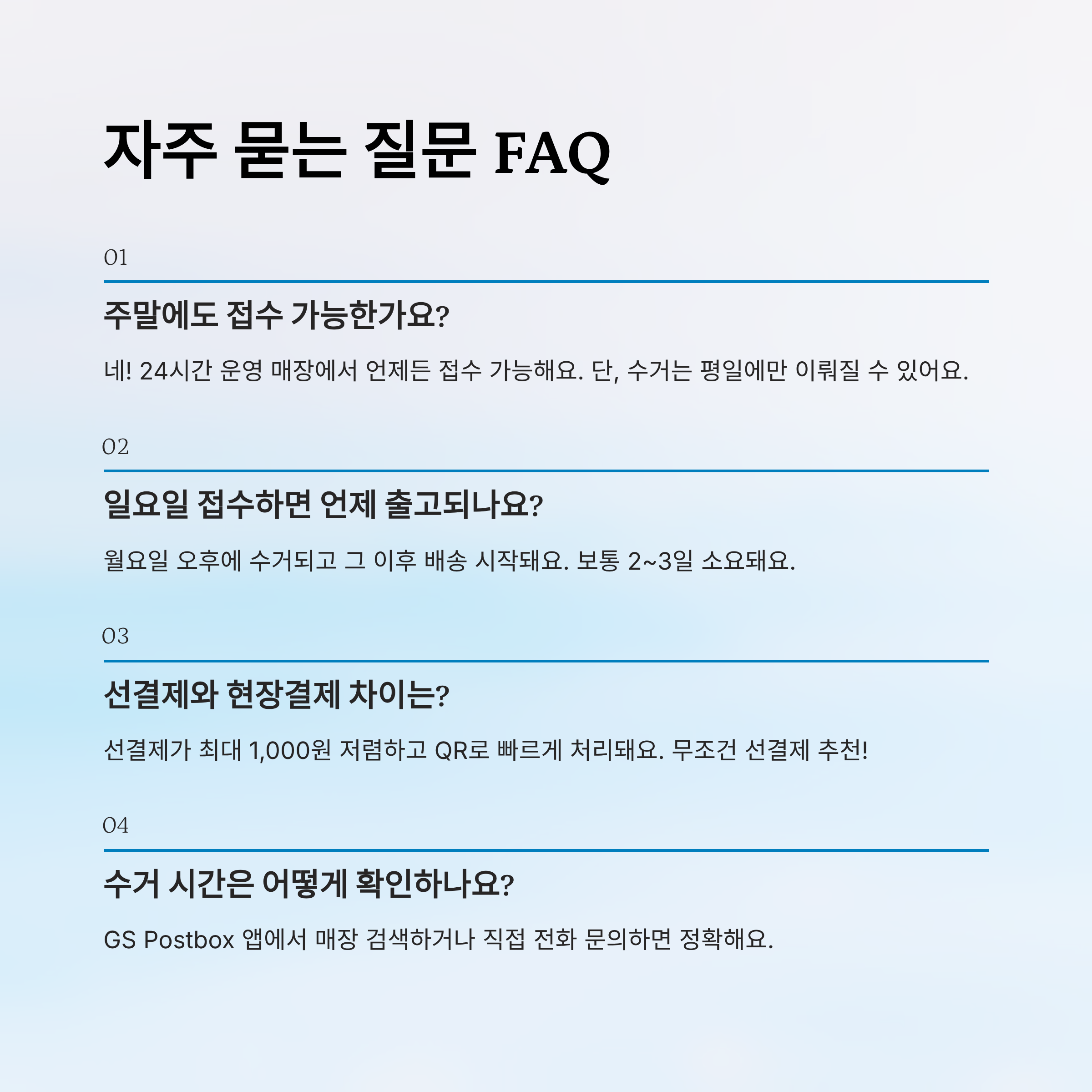 A3. 가능합니다! GS25는 24시간 운영되기 때문에 새벽이나 심야에도 키오스크를 이용해 접수할 수 있어요.