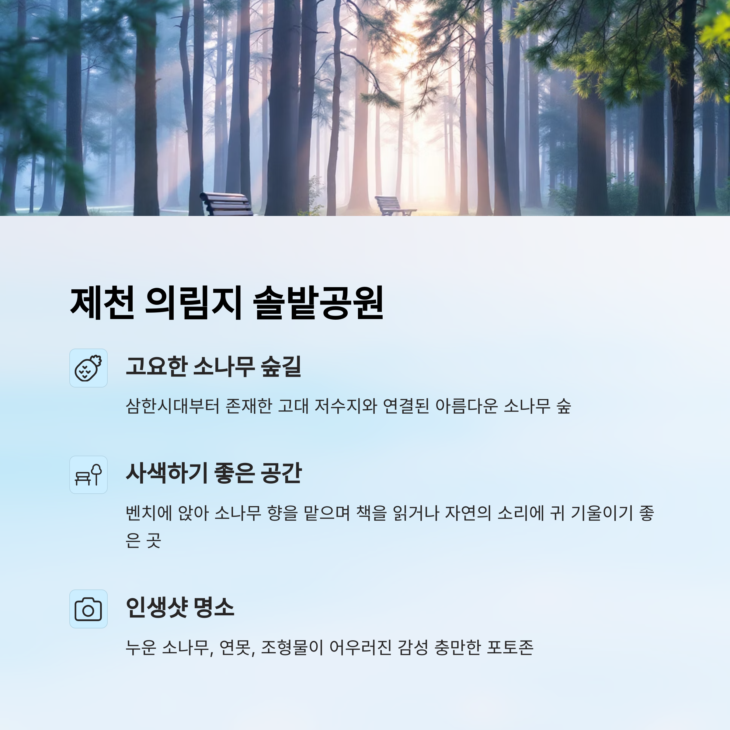 충북 제천의 '의림지 솔밭공원'은 삼한시대부터 존재했던 고대 저수지 '의림지'와 연결된 소나무 숲길이 특징이에요. 제천역과 가깝고 도심과도 인접해 있지만, 한걸음만 숲으로 들어가면 마치 다른 세상에 온 듯한 고요함이 펼쳐지죠. 이곳은 아침 햇살이 소나무 사이로 비칠 때 가장 아름다워요.