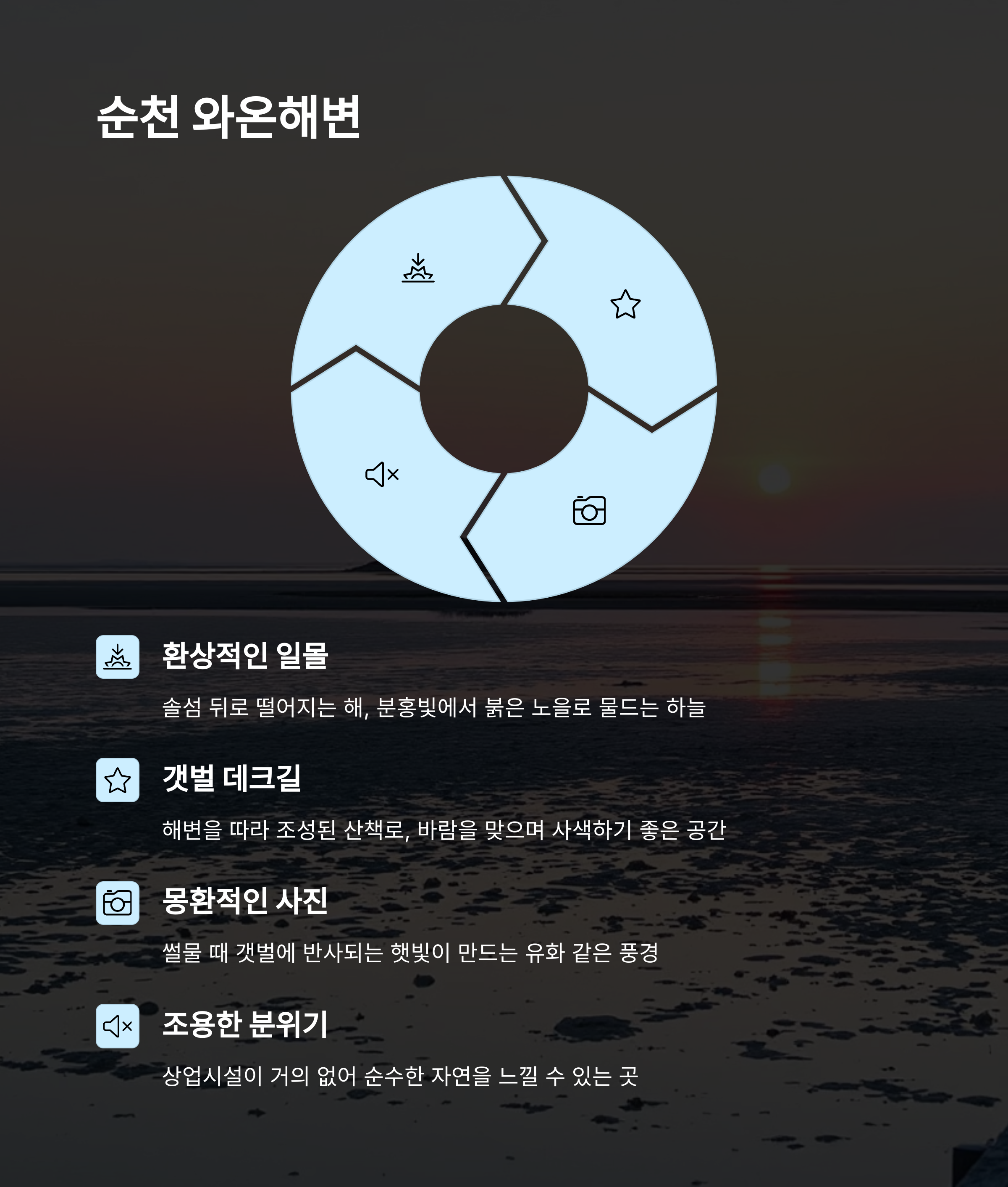 솔섬 앞 데크길이나 와온공원 전망대에서의 일몰은 '전국 일몰 명소 TOP 5'에 들어갈 만큼 아름답기로 소문났어요. 붉게 물든 하늘 아래에서 감성에 젖어보는 것도 혼자 여행의 묘미 중 하나겠죠? 🌇