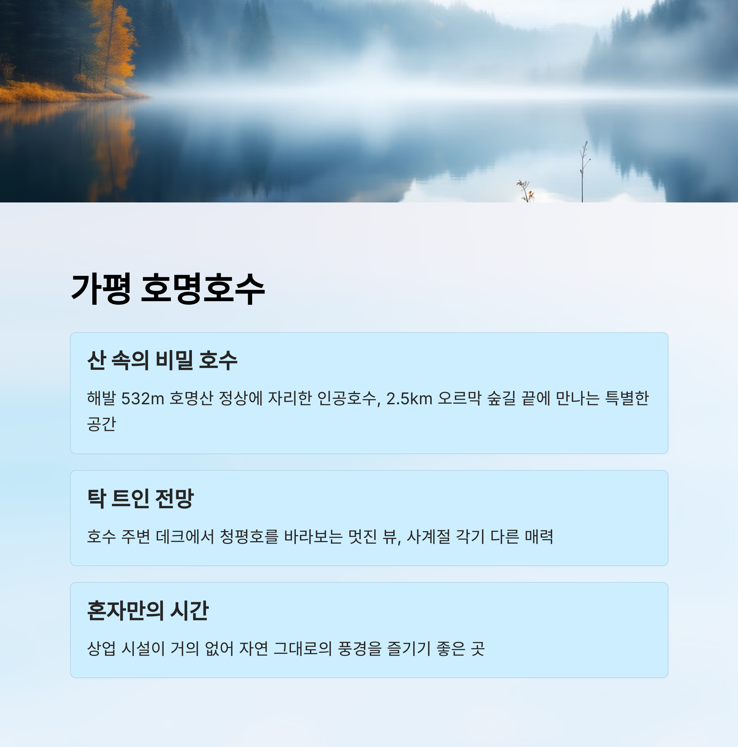 경기도 가평에 위치한 호명호수는 해발 532m 호명산 정상에 자리한 인공호수예요. 호수라고 해서 쉽게 접근할 수 있을 것 같지만, 사실 이곳은 산을 오르는 산책길 끝에 마주하게 되는 특별한 공간이에요. 그래서 더욱 고요하고, 비밀스럽게 느껴지죠.