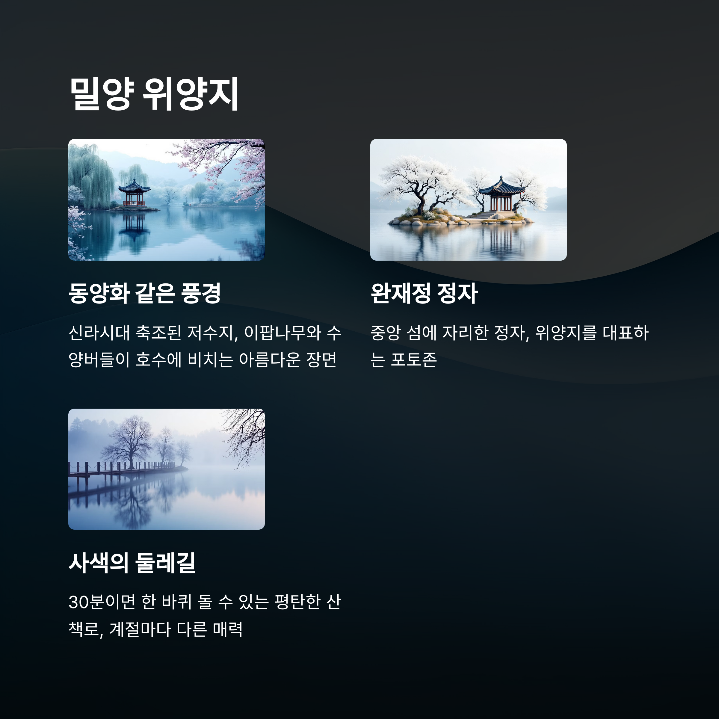 특히 위양지는 봄과 가을에 그 아름다움이 극대화돼요. 5월 이팝나무 꽃이 활짝 피면 호수 가장자리가 하얗게 물들고, 가을에는 붉은 단풍과 은은한 안개가 어우러져 몽환적인 풍경을 자아내요. 사진 찍기 좋은 장소로 입소문이 나 있지만, 조용함은 그대로 유지되고 있어요.