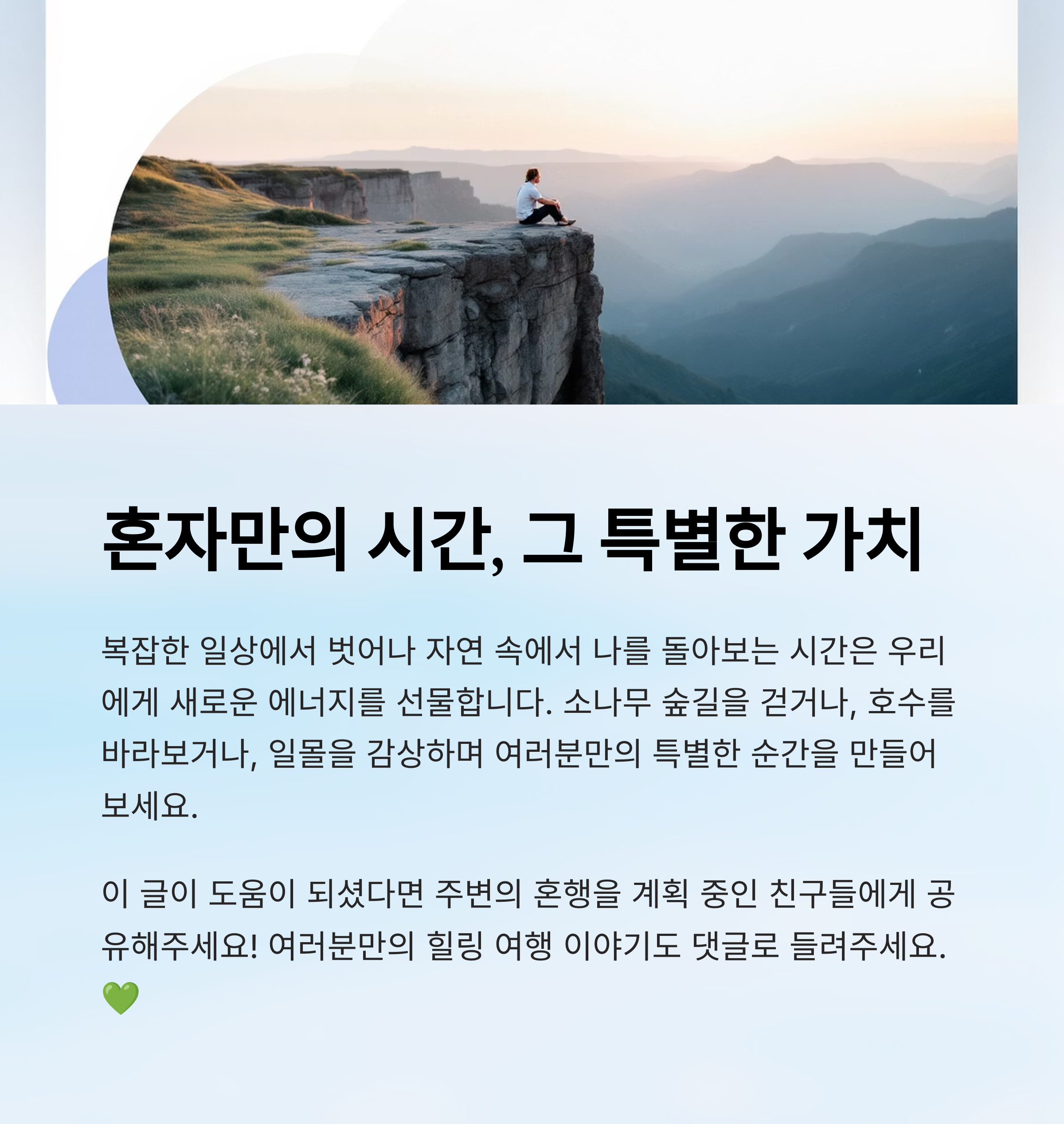 혼자 여행을 처음 시도하는 분이라면 이곳에서 조용한 시간을 보내며 그동안 미뤄둔 생각들을 꺼내 보는 것도 좋은 방법이에요. 너무 멀지도 않고, 너무 번잡하지도 않은 '딱 좋은 거리감'의 힐링지랍니다.
