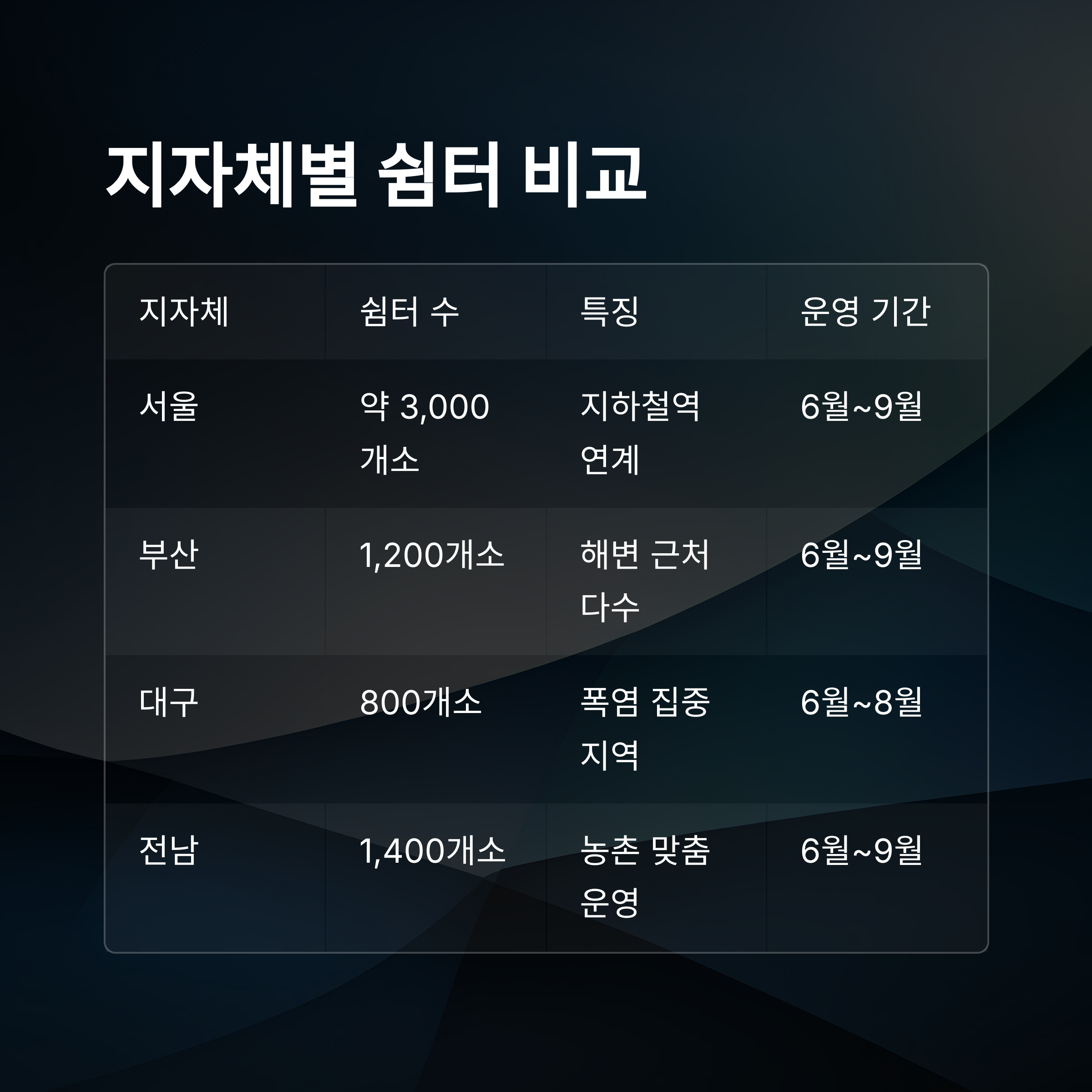 | 지자체 | 쉼터 수 | 특징 | 앱 제공 | 운영 기간 |