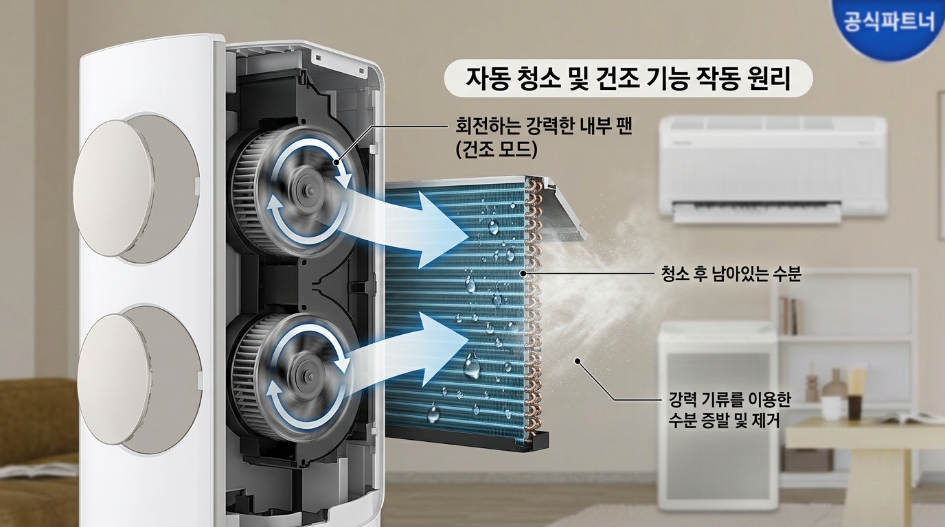 에어컨의 적은 '곰팡이'와 '냄새'죠. 이 모델은 전원을 끄면 내부의 수분을 말려주는 '자동 청소 건조' 기능이 탑재되어 있습니다. 에어컨 내부가 습하면 곰팡이가 생기기 쉬운데, 알아서 뽀송하게 말려주니 위생 걱정도 덜고 꿉꿉한 냄새도 방지해줍니다. 10분 정도 걸리지만 건강을 위해 꼭 필요한 과정입니다.