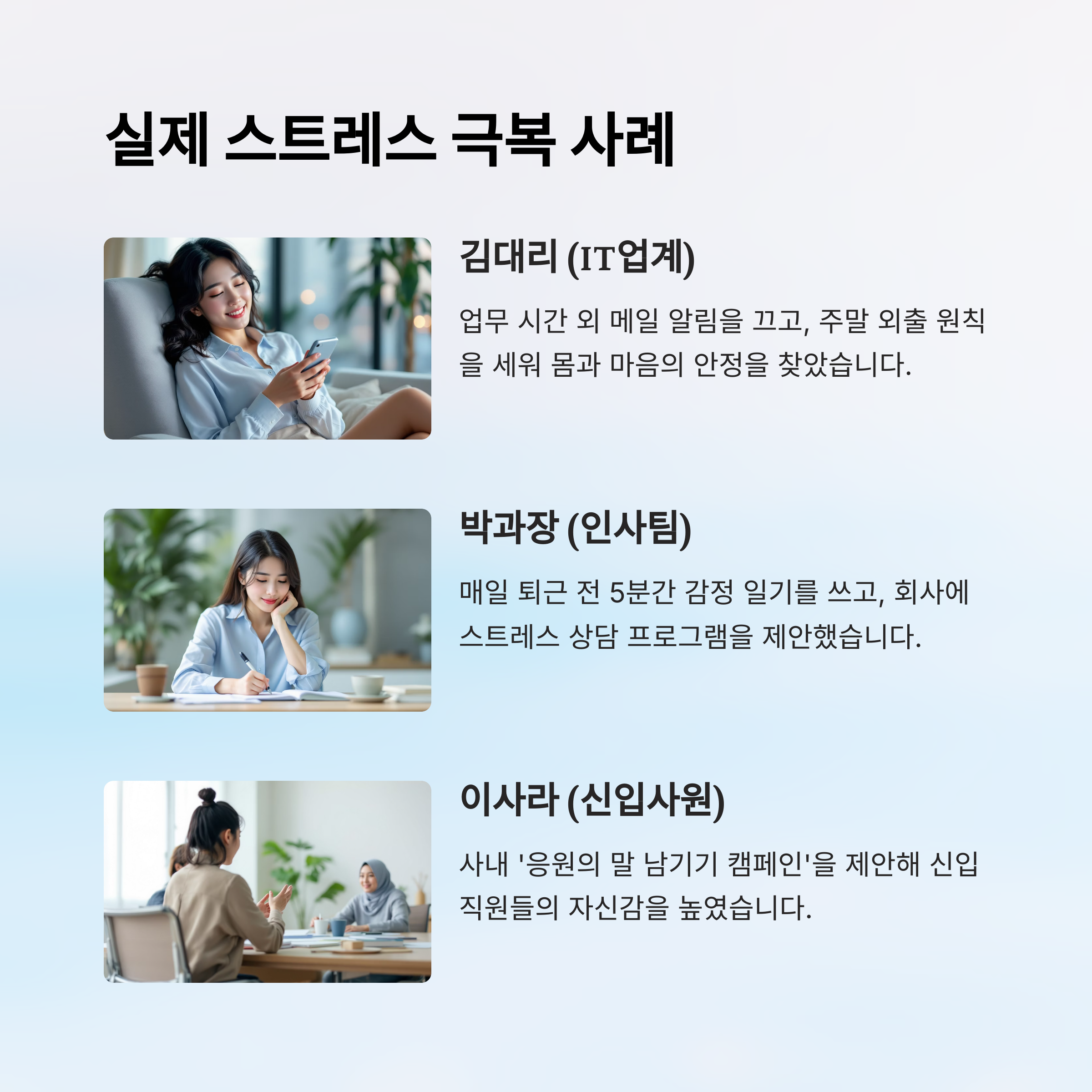 현실적인 이야기만큼 공감이 되는 것도 없죠. 그래서 이번엔 실제로 직장 스트레스를 극복한 사례들을 소개할게요. 여러분이 겪는 고민이 혼자만의 것이 아님을 느끼고, 작은 실천이 큰 변화를 만들 수 있다는 희망도 함께 전하고 싶어요.