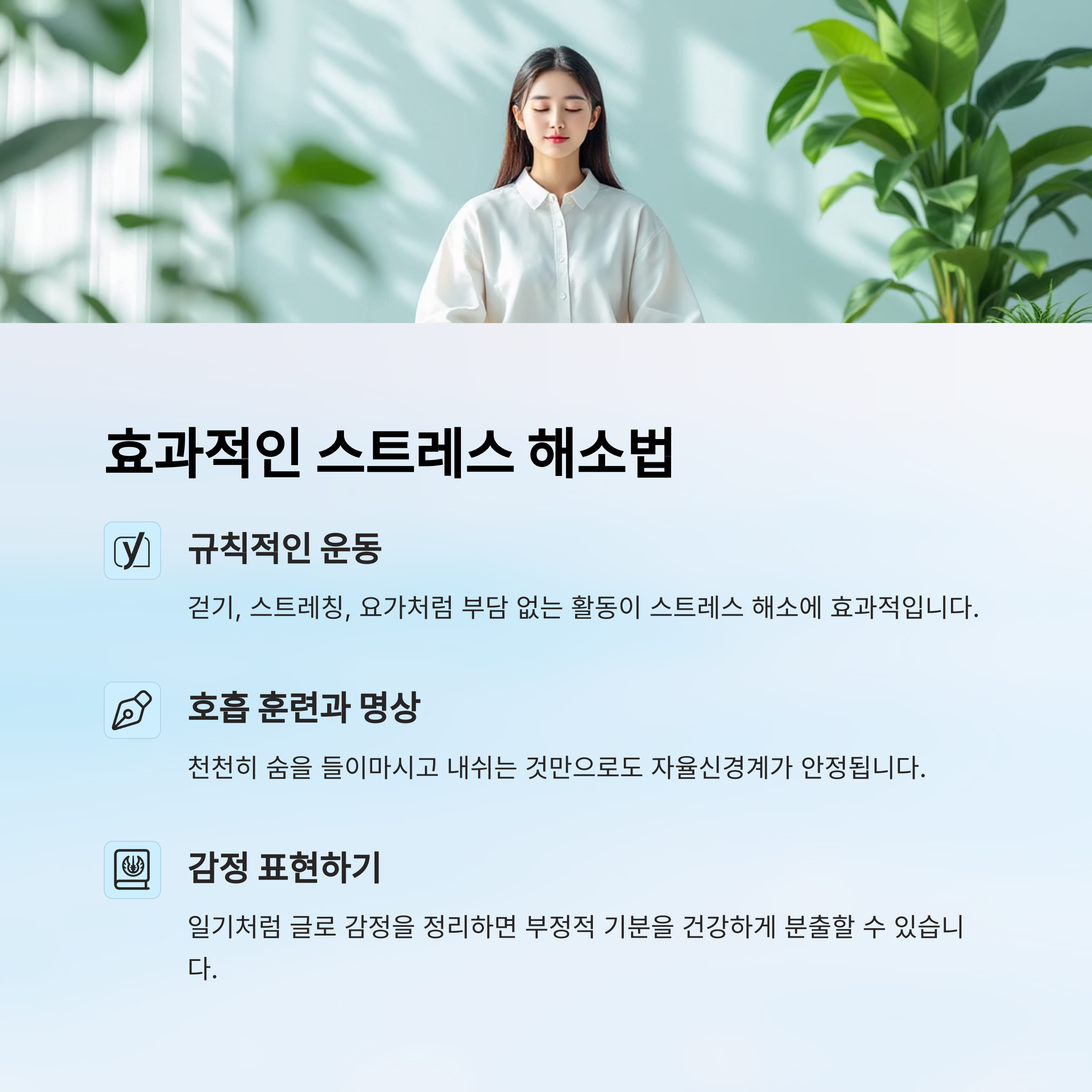 스트레스를 받는 것 자체는 피할 수 없지만, 이를 어떻게 다스리느냐에 따라 삶의 질이 완전히 달라져요. 가장 기본적인 해소 방법은 규칙적인 수면과 식사, 그리고 운동이에요. 특히 걷기, 스트레칭, 요가처럼 부담 없이 할 수 있는 활동이 스트레스 해소에 효과적이에요.