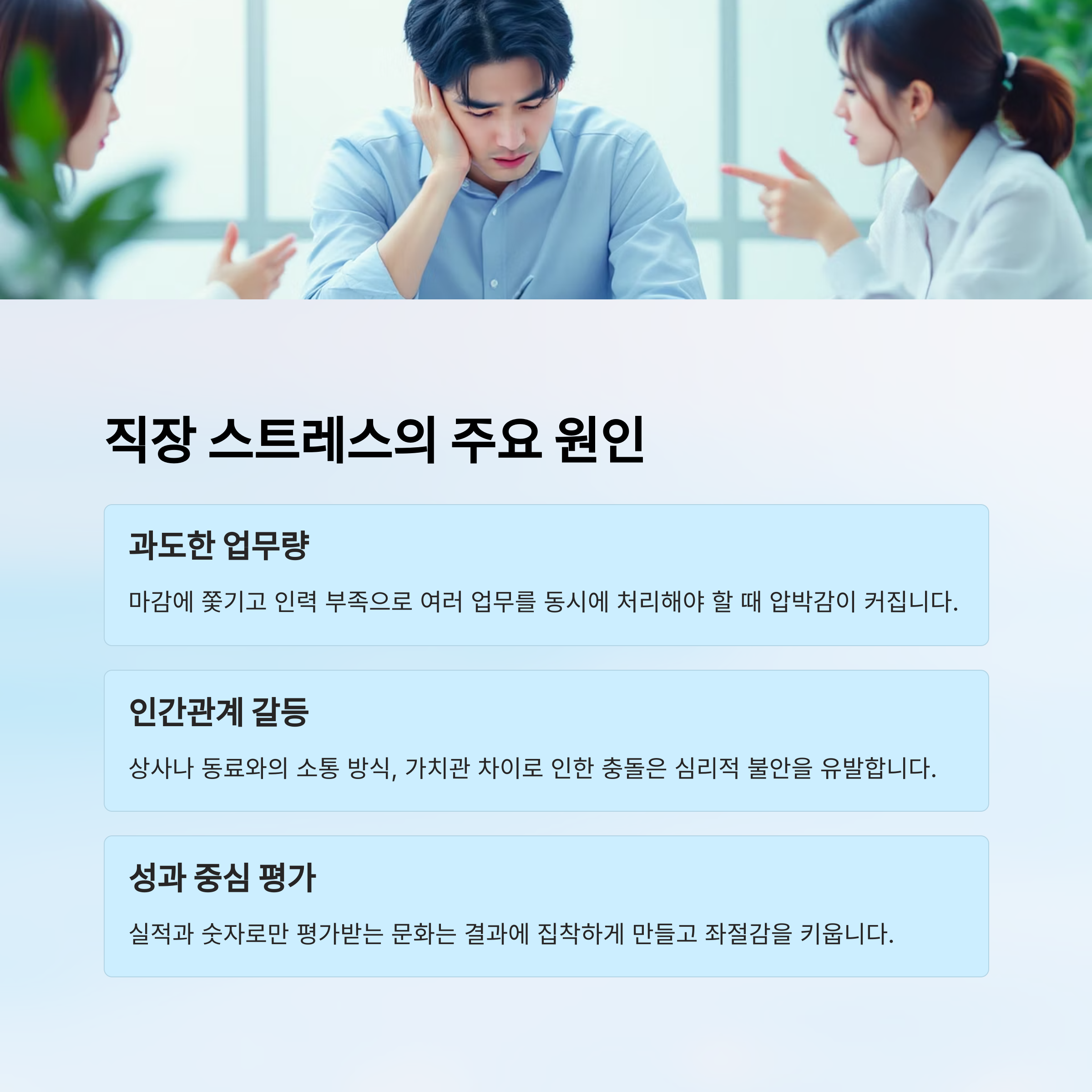 이처럼 직장 내 스트레스는 단순한 짜증이나 피로 이상의 문제예요. 이는 업무 성과뿐 아니라 개인의 삶 전반에 영향을 주기 때문에 조기에 원인을 파악하고 적절히 대응하는 게 정말 중요해요.
