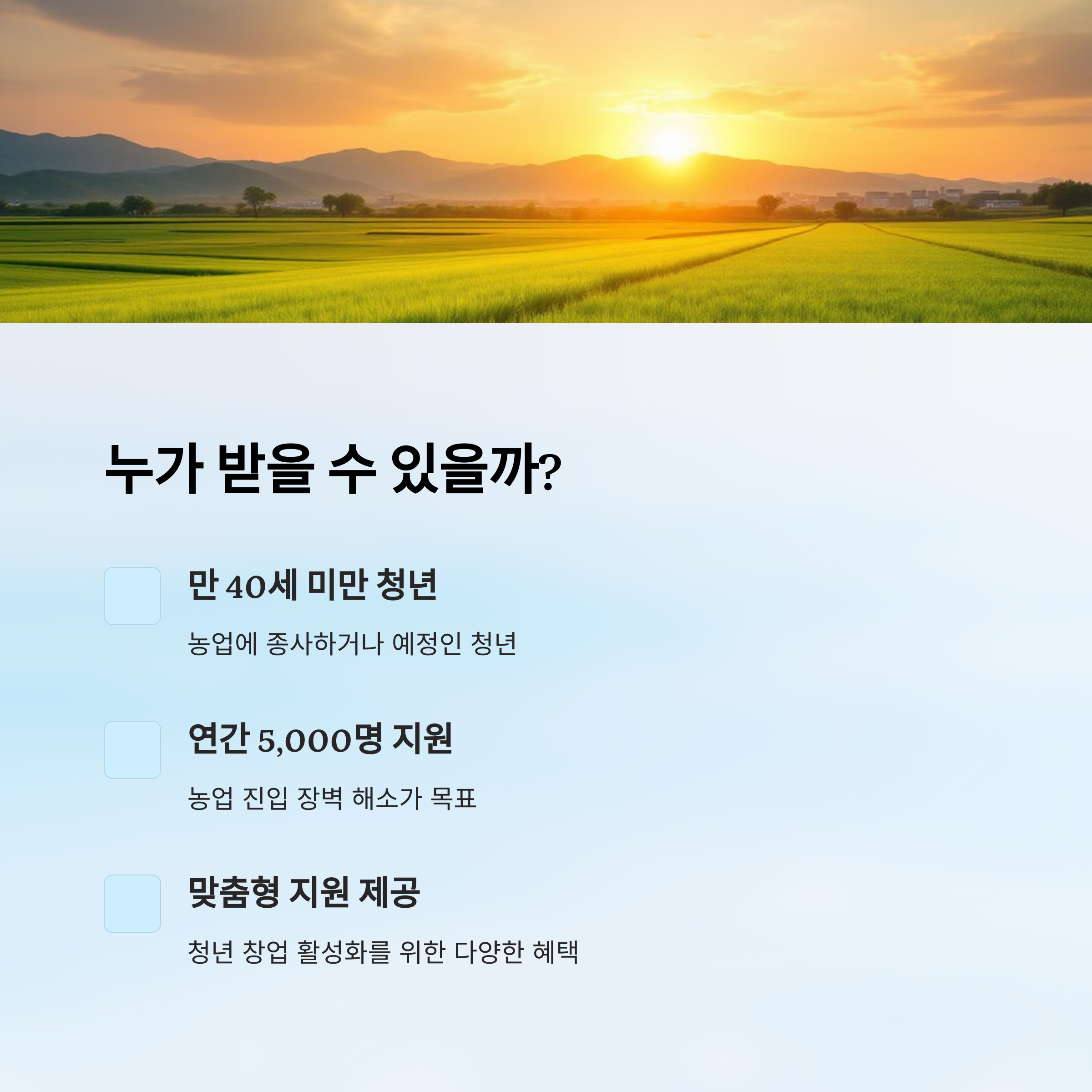 지금까지 청년농 창업지원금 제도에 대한 큰 그림을 살펴봤어요. 이제 다음 박스에서는 **신청 자격과 조건**을 구체적으로 정리해드릴게요! 😊