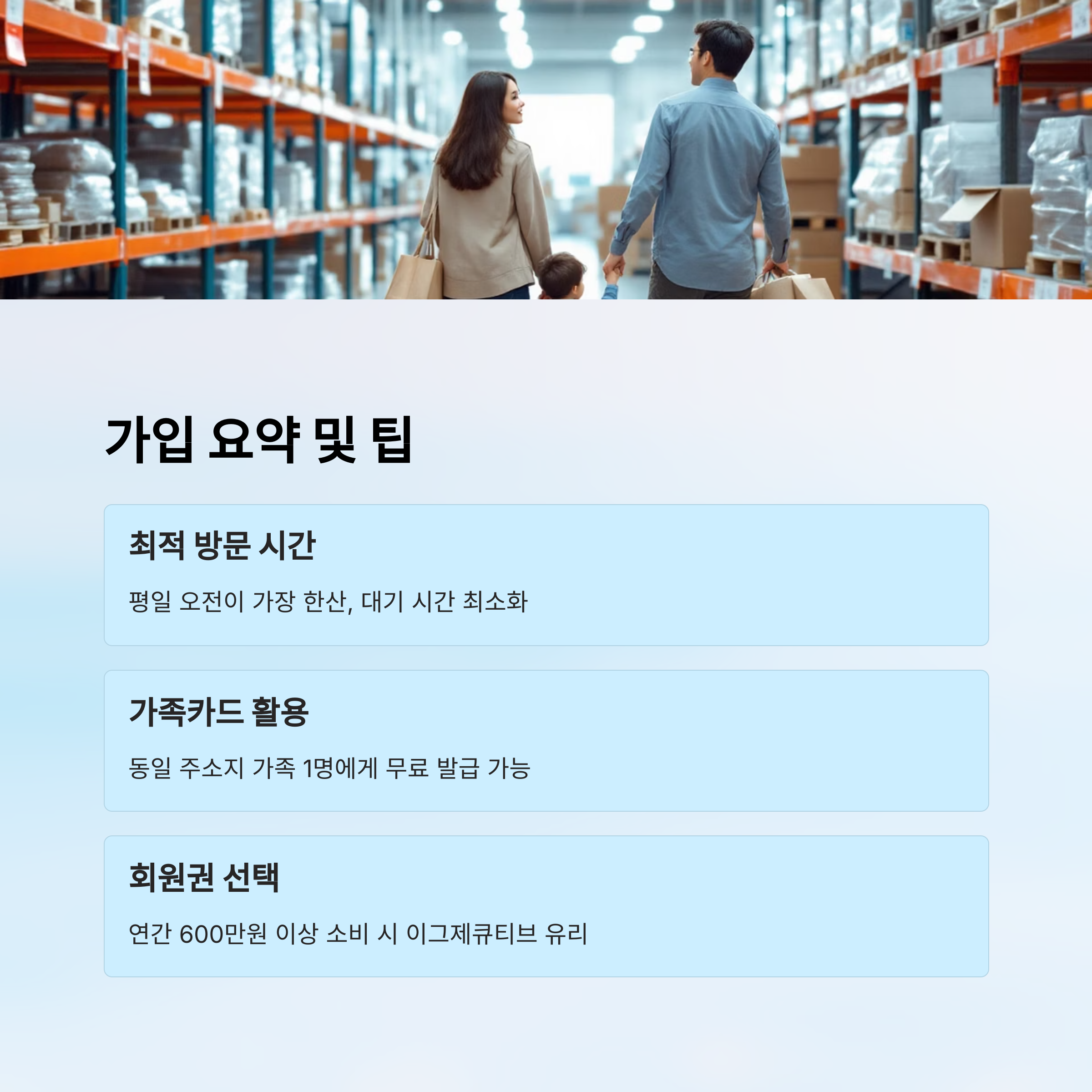 모든 회원권은 1년 단위로 갱신되며, 가족카드는 본회원과 동일 주소지에 거주하는 가족 1인에게 무료로 발급돼요. 특히 이그제큐티브는 혜택이 많아서 소비가 많은 가정이나 자영업자에게 유용해요.