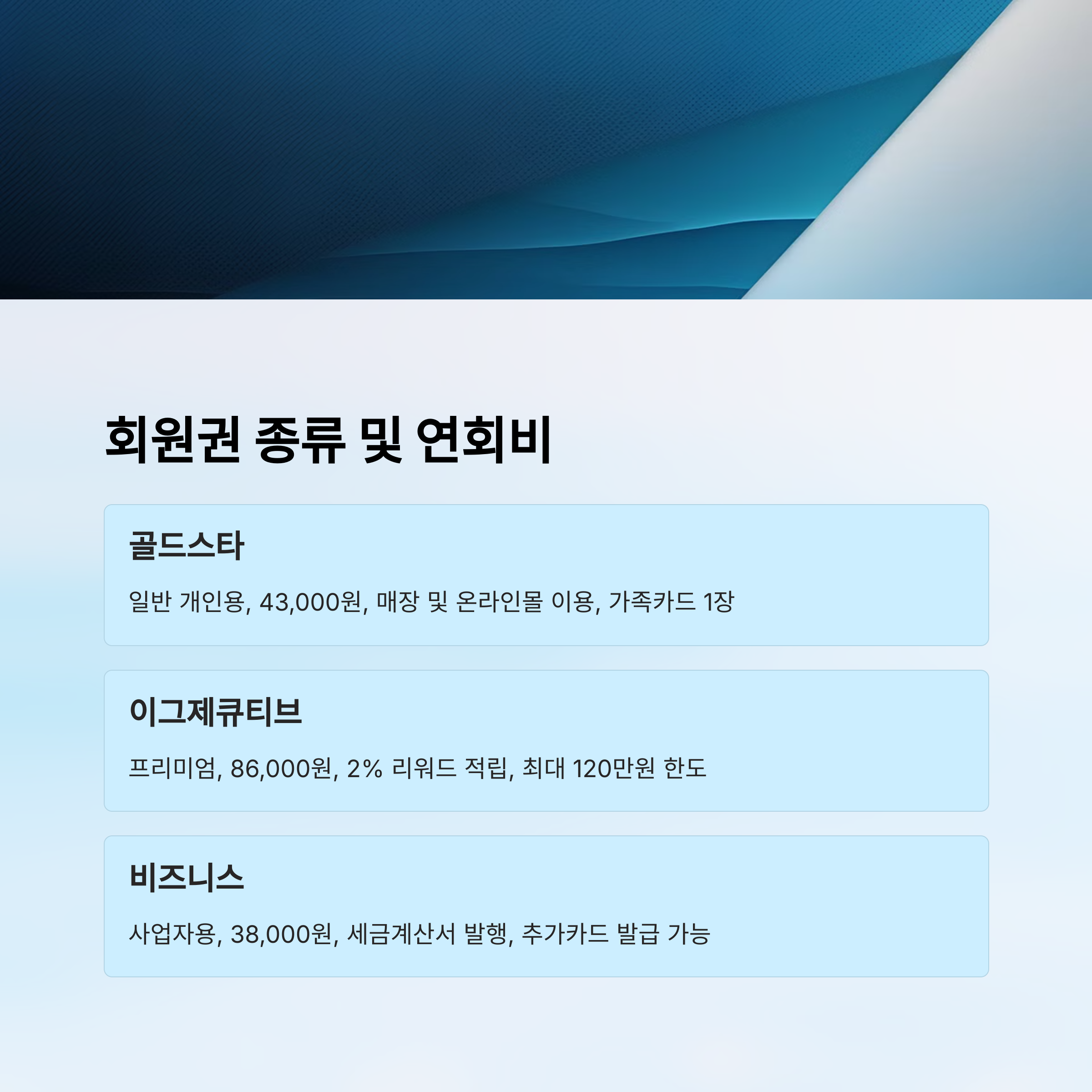 회원권의 종류가 다양한 만큼, 자신의 소비 패턴과 필요에 따라 현명하게 선택해보세요. 고급 혜택을 원한다면 이그제큐티브가, 실속 있게 이용하고 싶다면 골드스타나 비즈니스 회원권이 좋아요.