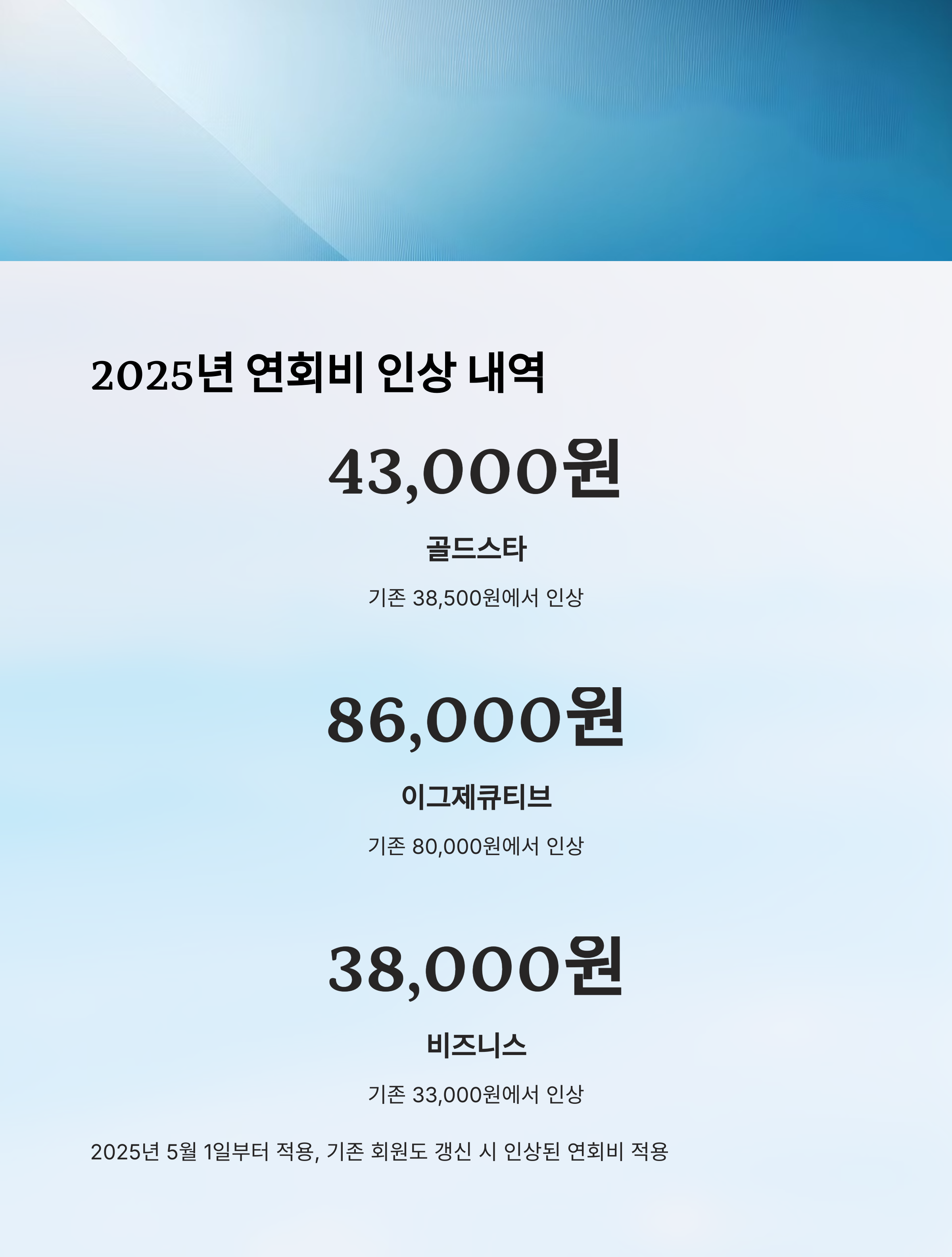 2025년 5월 1일부터 연회비가 인상되었어요. 골드스타는 기존 38,500원에서 43,000원으로, 비즈니스 회원권은 33,000원에서 38,000원으로 조정됐어요. 이그제큐티브 회원권은 80,000원에서 86,000원으로 변경되었고요.