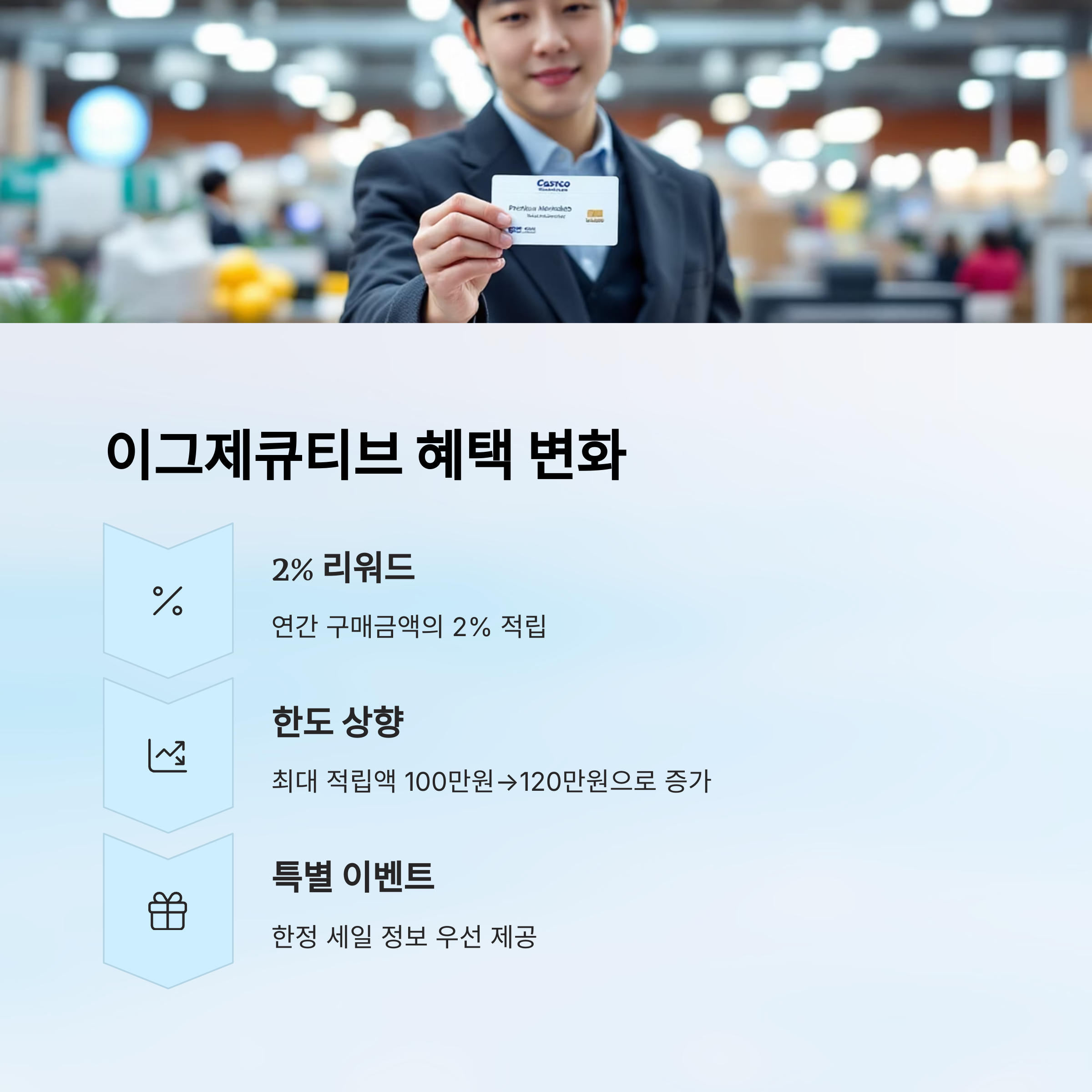 "내가 생각했을 때"는 이그제큐티브 회원권의 리워드 한도 상향이 가장 큰 변화인 것 같아요. 연간 소비가 많은 분들에겐 분명 더 유리하니까요.