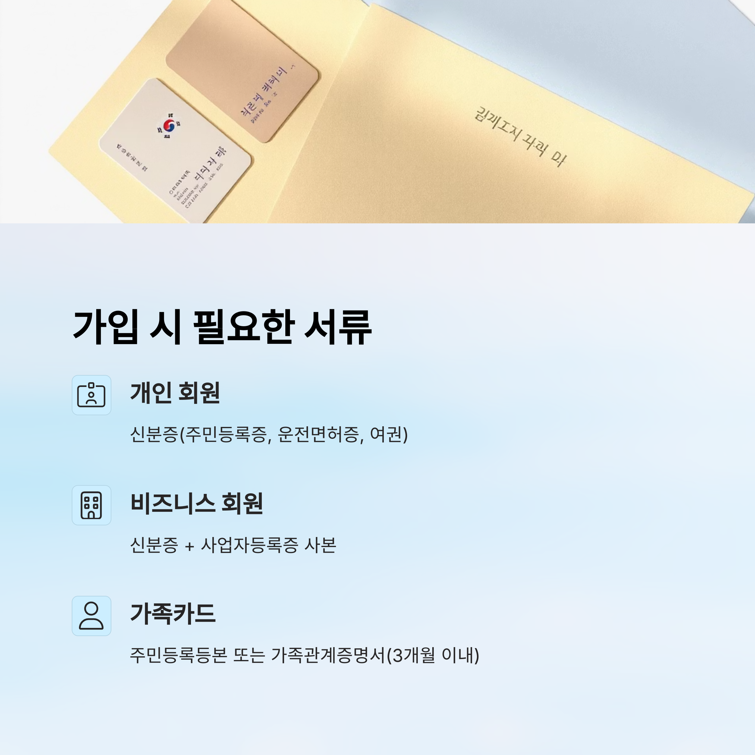 개인 회원 가입 시에는 신분증 하나면 충분해요. 주민등록증, 운전면허증, 또는 여권 중 하나를 지참하면 돼요. 오프라인 가입 시에는 회원가입 신청서를 작성한 뒤 현장에서 사진 촬영이 이뤄지고, 바로 멤버십 카드가 발급돼요.