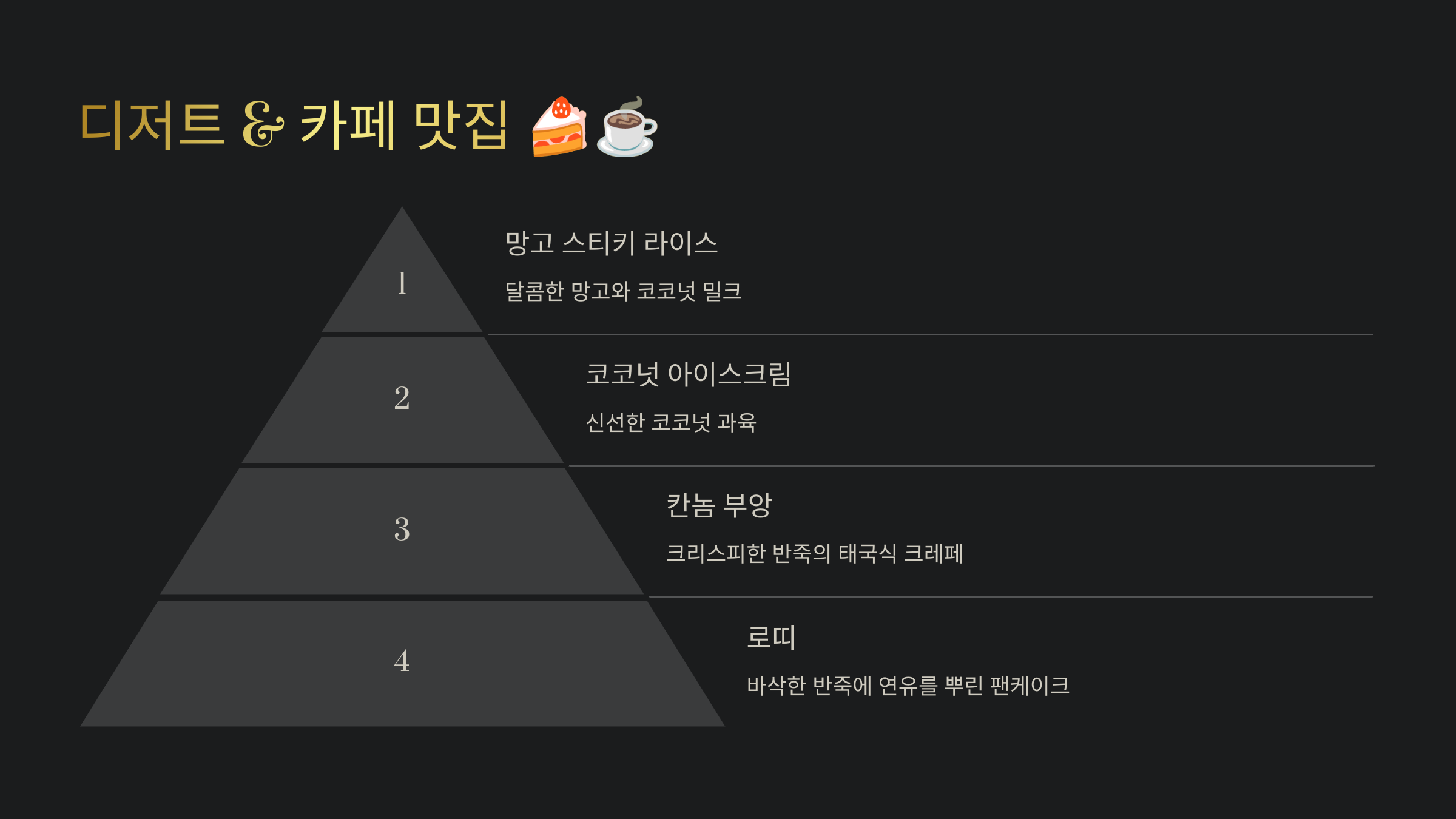 태국은 망고, 코코넛, 타로 등을 활용한 달콤한 디저트가 유명해요. 방콕에서 **SNS 핫플 카페부터 전통 디저트 맛집까지** 추천 리스트를 정리했어요! 🍮✨