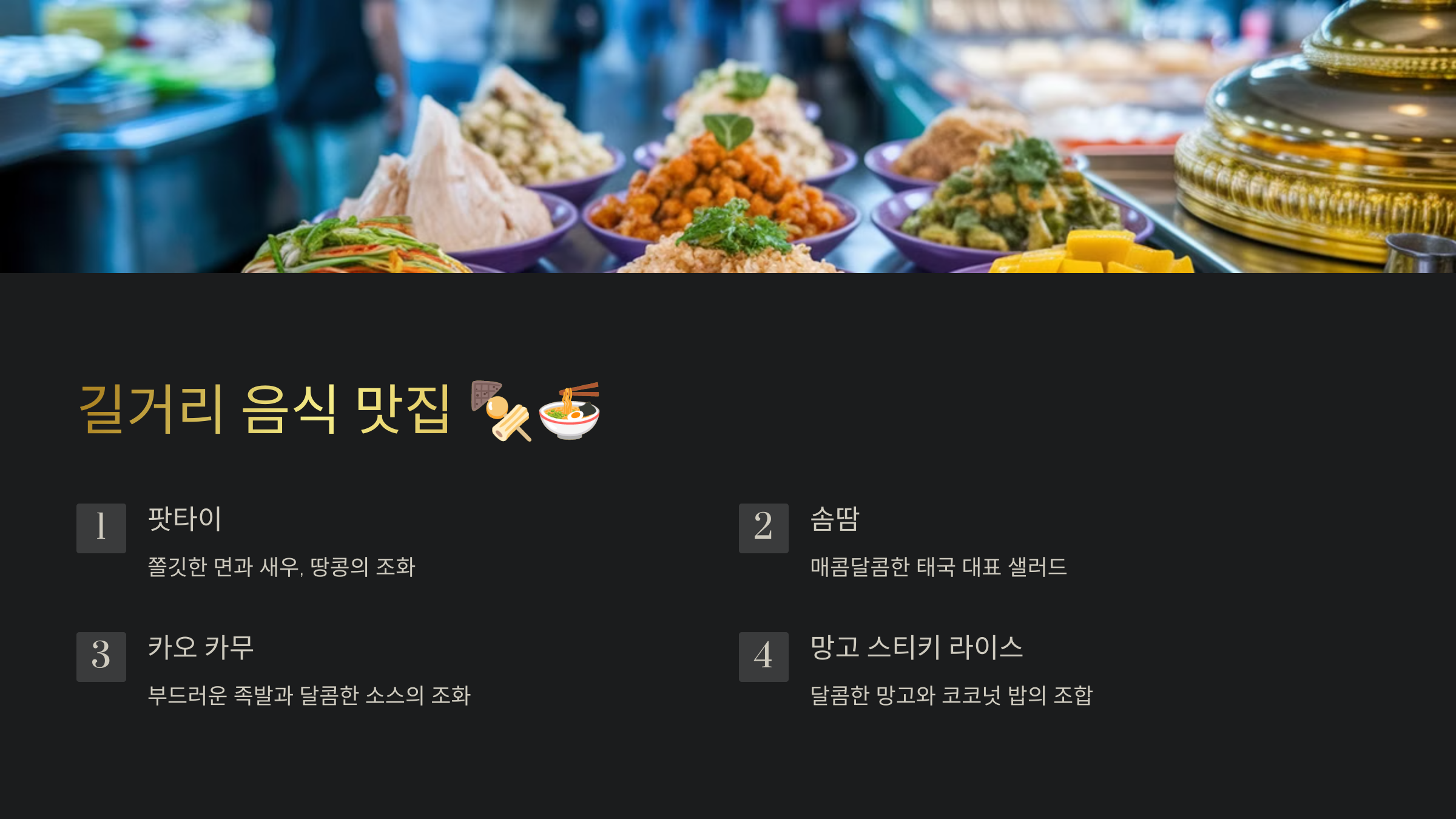 방콕 여행에서 **길거리 음식(스트리트 푸드)**을 빼놓을 수 없어요! 저렴한 가격에 태국의 진짜 맛을 느낄 수 있는 **현지인 추천 길거리 맛집**을 소개할게요. 😋