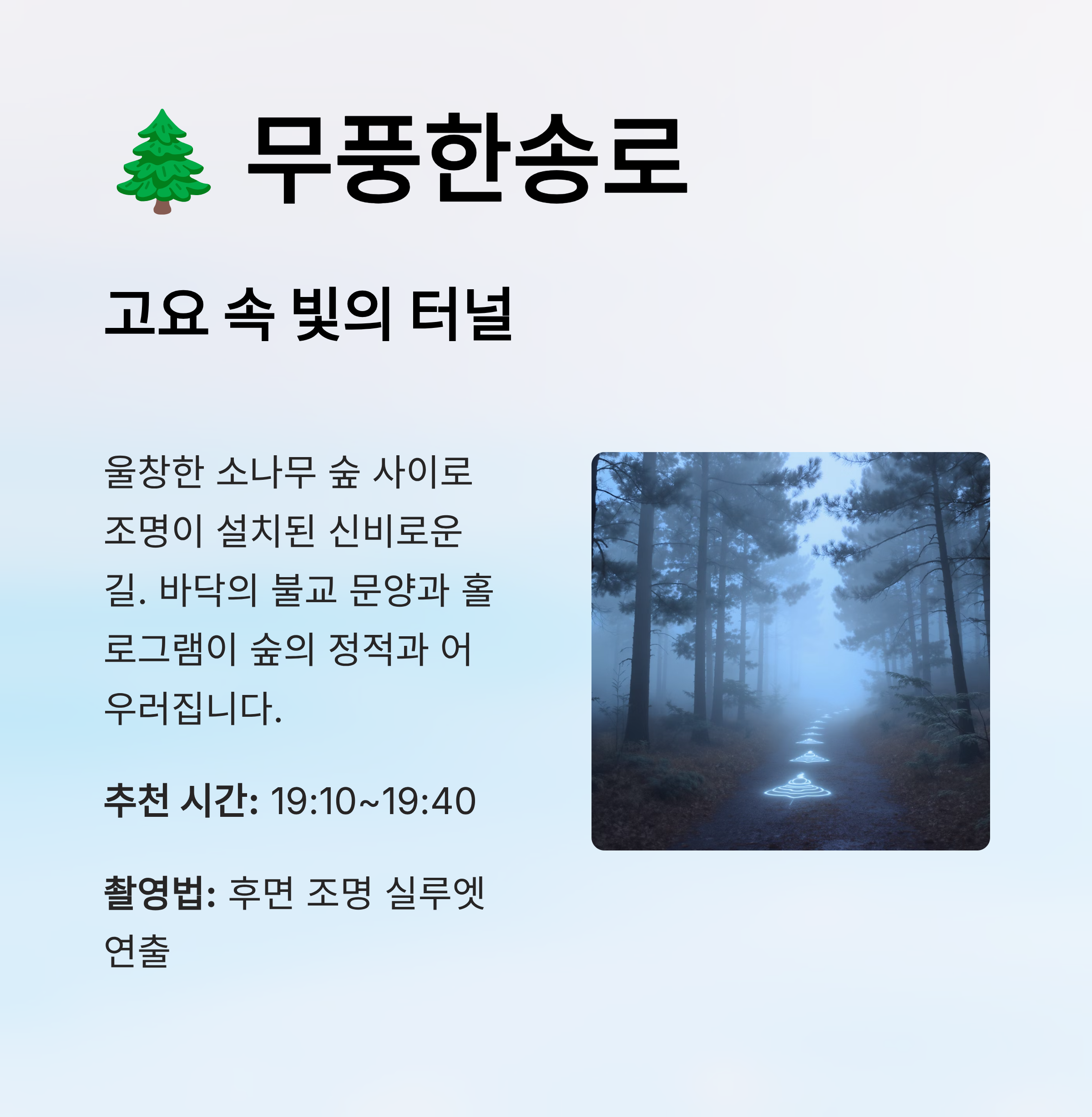| 무풍한송로 | 후면 조명 실루엣 | 자연 어둠 + 미디어 빛 | 몽환적, 감성적 |