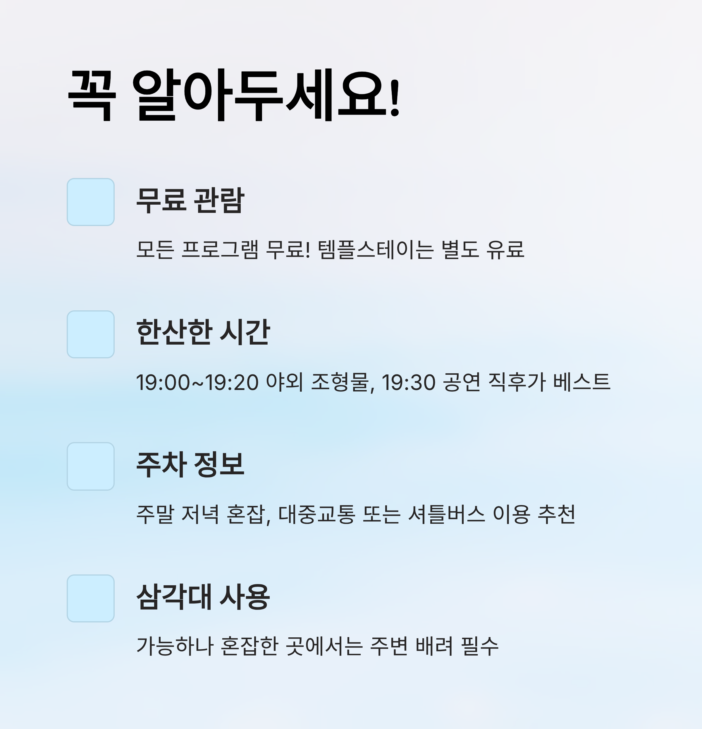A2. 야외 조형물은 19:00~19:20 사이, 공연은 19:30 공연 직후가 비교적 한산해요. 일찍 도착하거나 늦게 이동하는 전략이 좋아요.