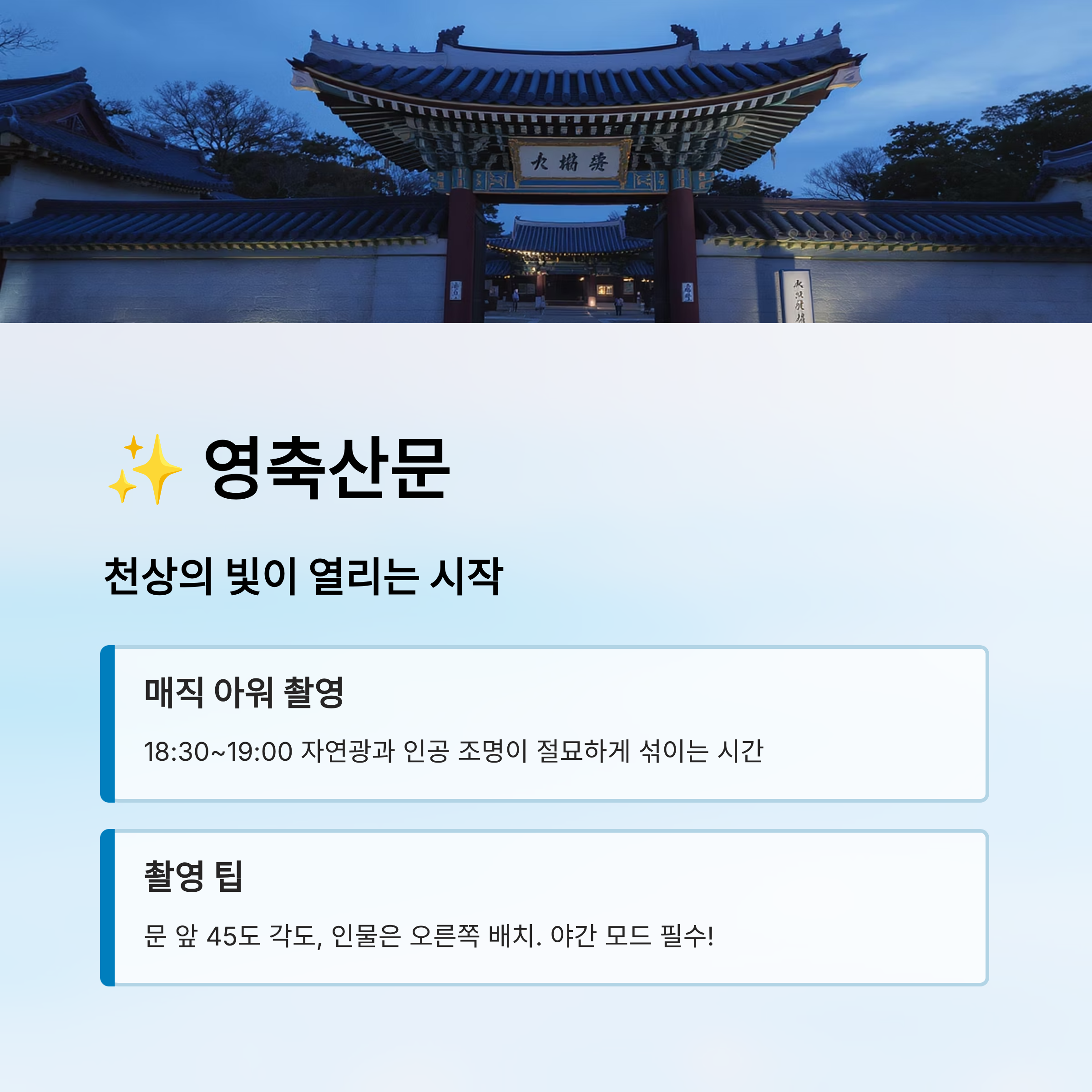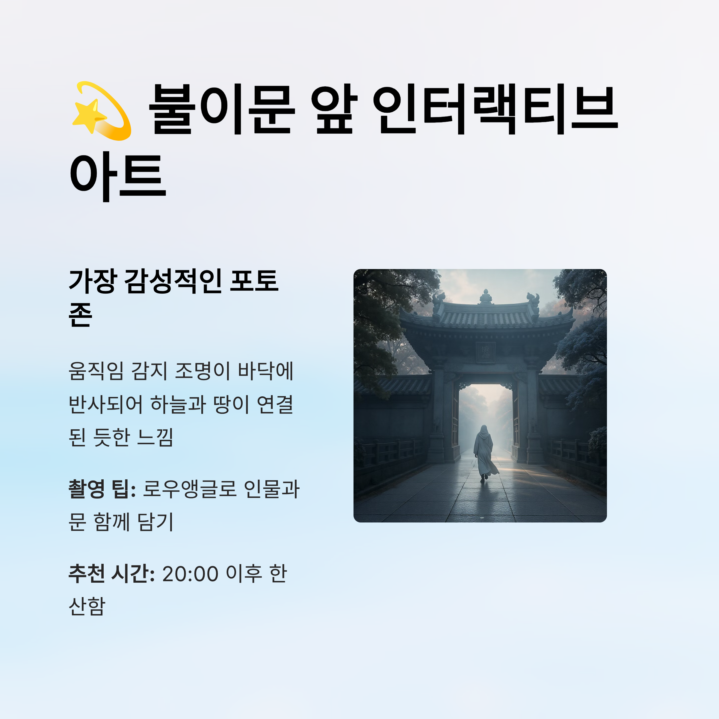 📸 *촬영 팁*: 낮은 앵글로 인물과 불이문을 함께 담고, 주변 바닥 조명이 프레임에 충분히 들어오도록 해보세요. 뒷배경은 어두울수록 좋아요.