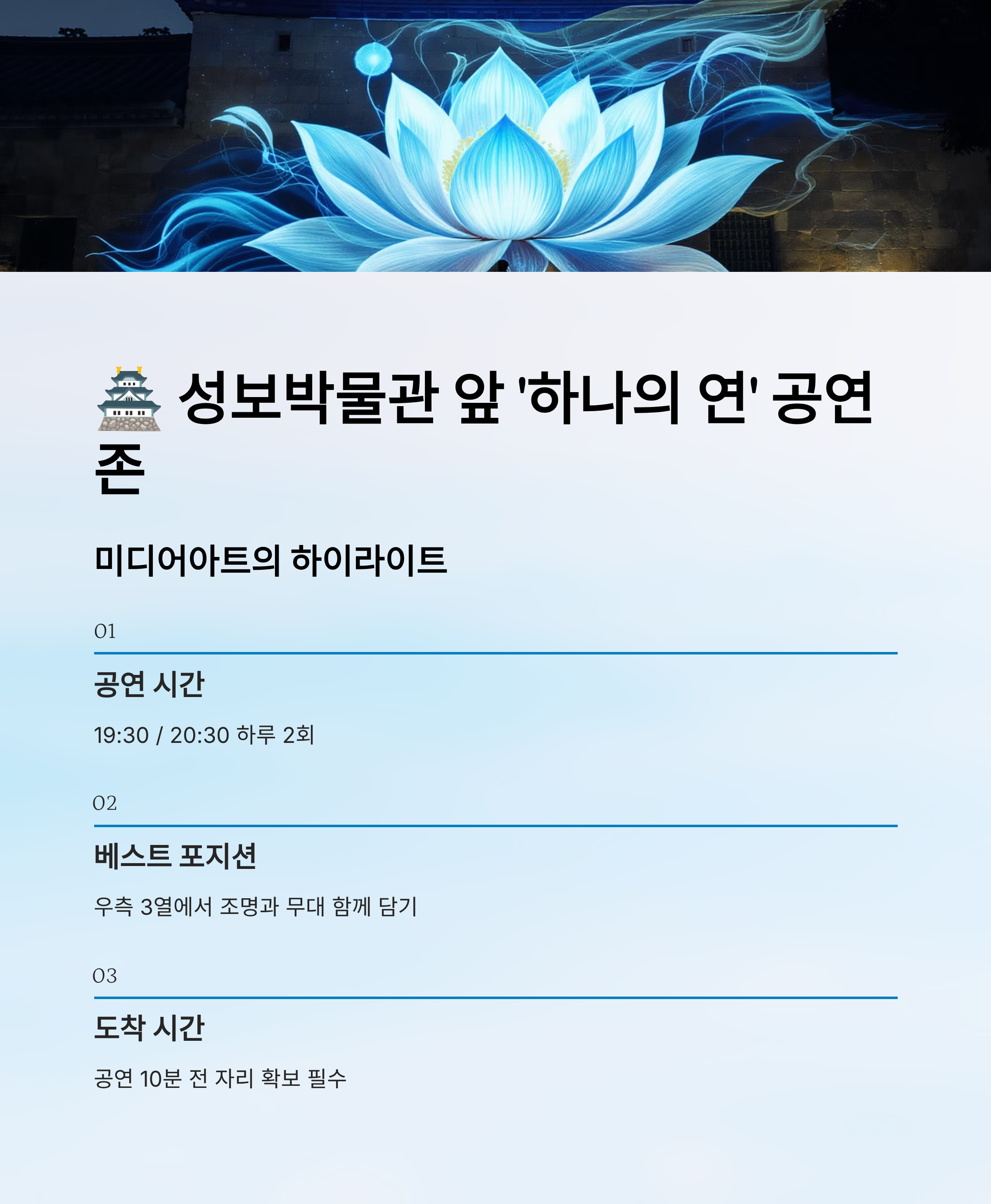 📸 *촬영 팁*: 공연장 오른쪽 측면 3열에서 촬영하면, 조명과 무대가 함께 들어와요. 라이브 포토나 영상 촬영이 훨씬 생생해요.