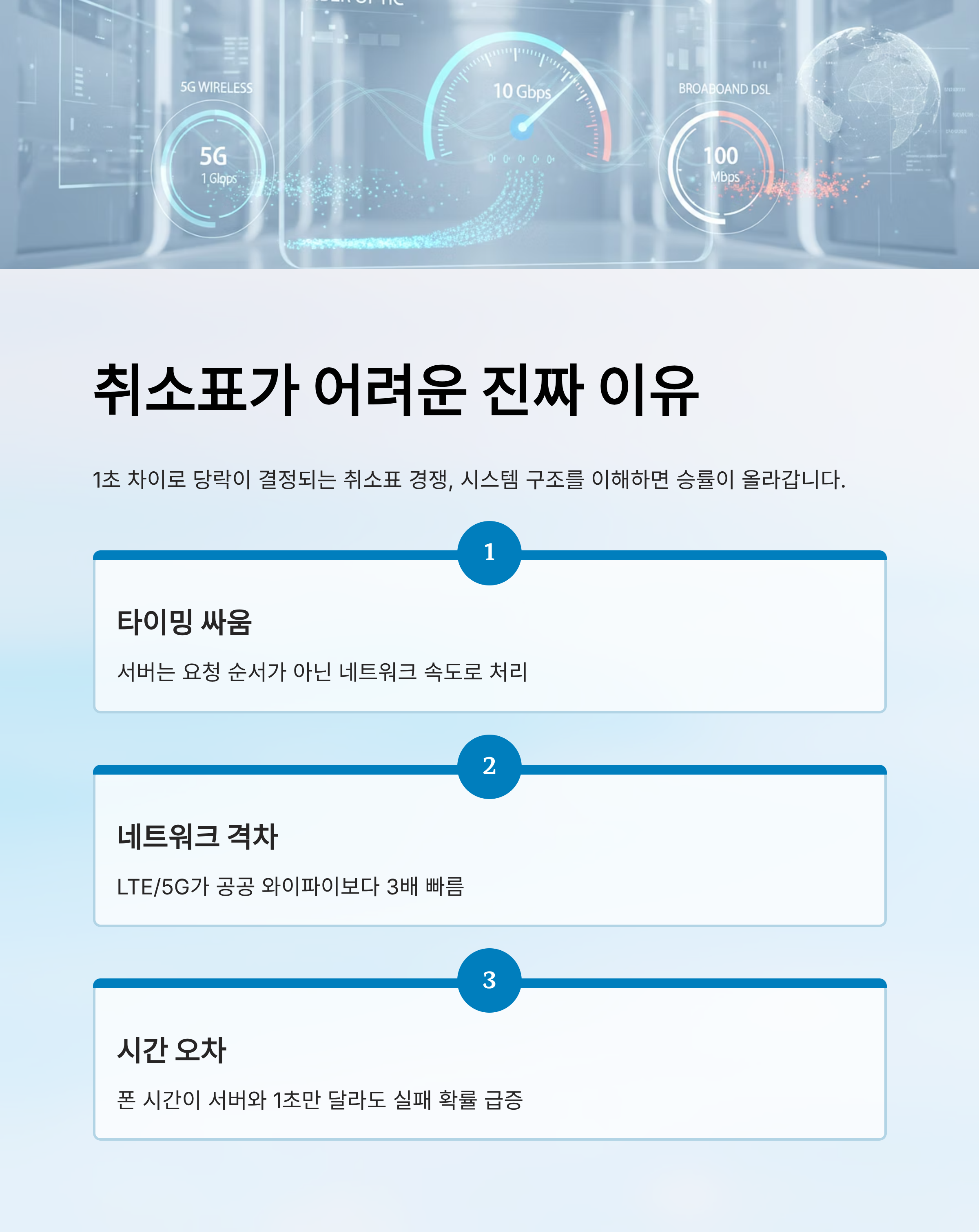 서버는 요청이 들어온 순서대로 처리하지 않아요. 네트워크 지연이나 통신 속도, 심지어는 단말기의 시간 오차까지 영향을 미칩니다. 모바일 데이터보다 와이파이가 더 빠를 거라고 생각하기 쉽지만, 실제로는 반대일 때도 많아요. 예를 들어, 사람이 많은 카페 와이파이보다 LTE나 5G 데이터가 훨씬 안정적인 경우가 많답니다. 따라서 취소표를 잡을 때는 네트워크 환경을 먼저 점검해야 해요.