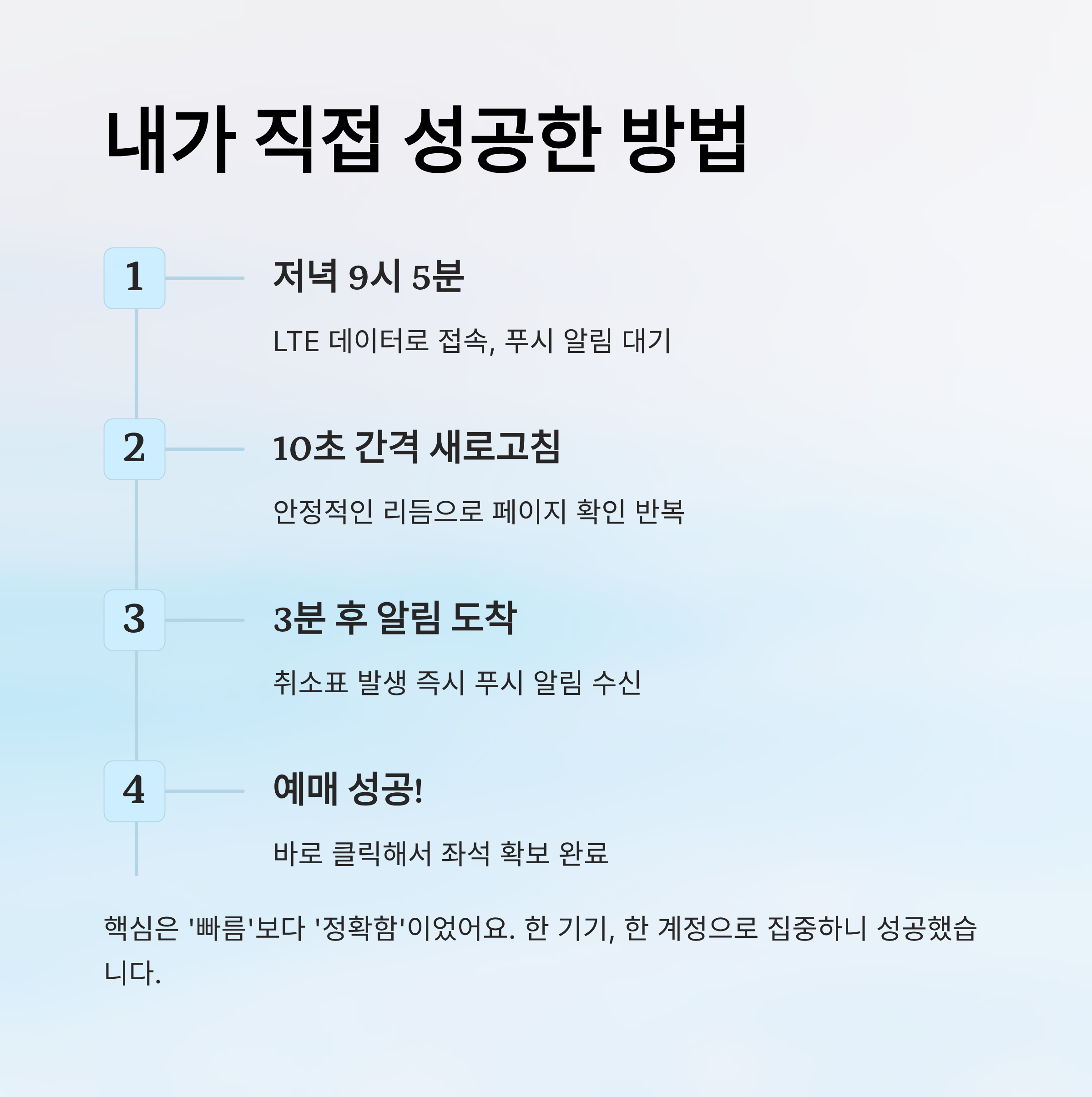 성공 후 주변 친구들에게 이 방법을 알려줬는데, 그들도 대부분 1주일 안에 취소표를 성공했어요. 다들 공통적으로 말했죠. “폰으로 하니까 훨씬 편하고 빠르다!” 라고요. 특히 직장인이나 학생처럼 PC 앞에 오래 앉아 있을 수 없는 사람들에게는 이 모바일 전략이 완전 구세주예요.