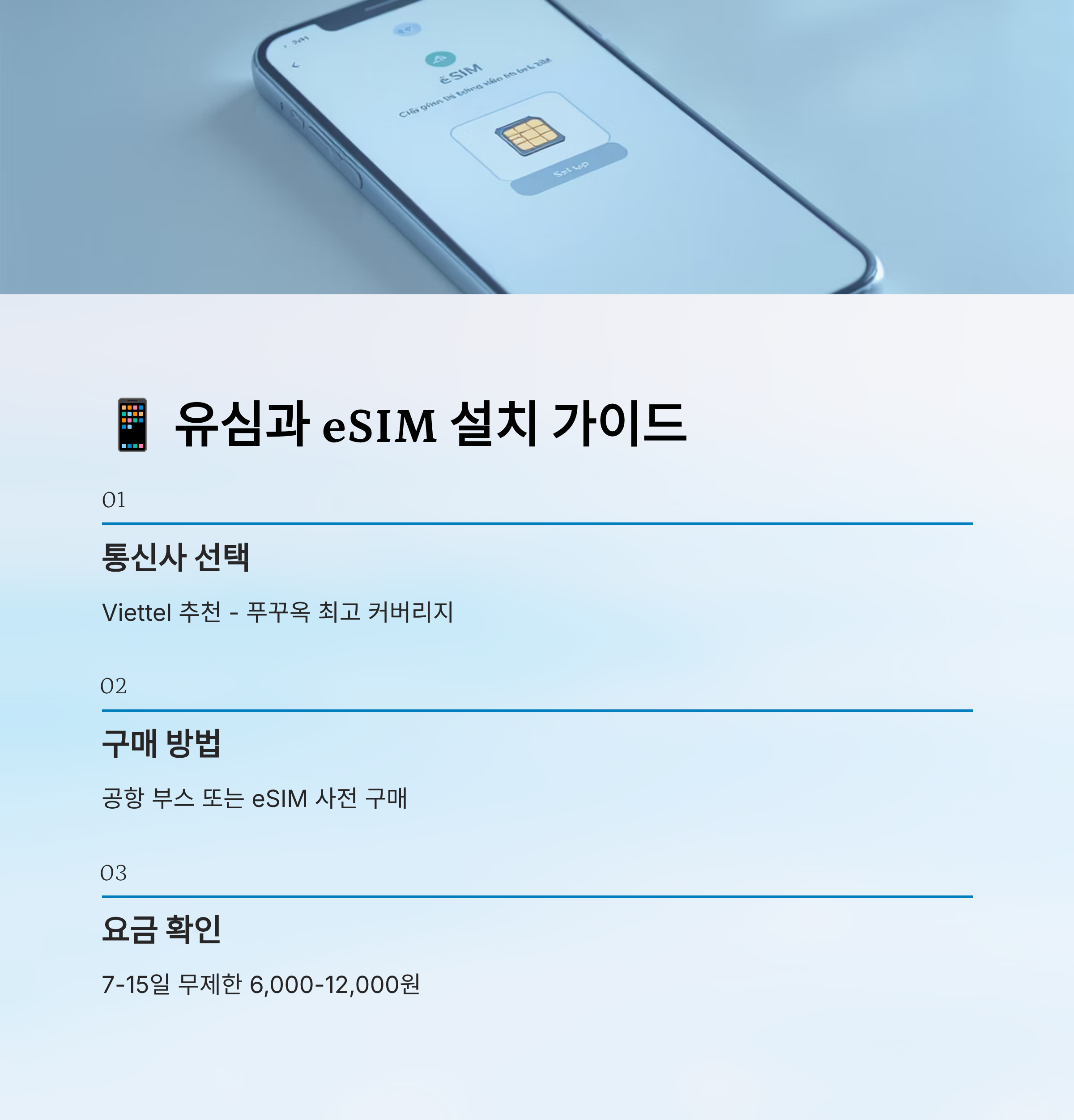 요즘에는 eSIM도 인기가 많아요. 스마트폰 설정만으로 개통할 수 있어서 유심 갈아 끼울 필요가 없고, 한국에서 미리 구매하고 설치할 수도 있어요. 예를 들어 Airalo, Nomad, Gigago 같은 플랫폼에서 eSIM을 미리 사면 푸꾸옥 도착 전에 개통도 가능하죠!
