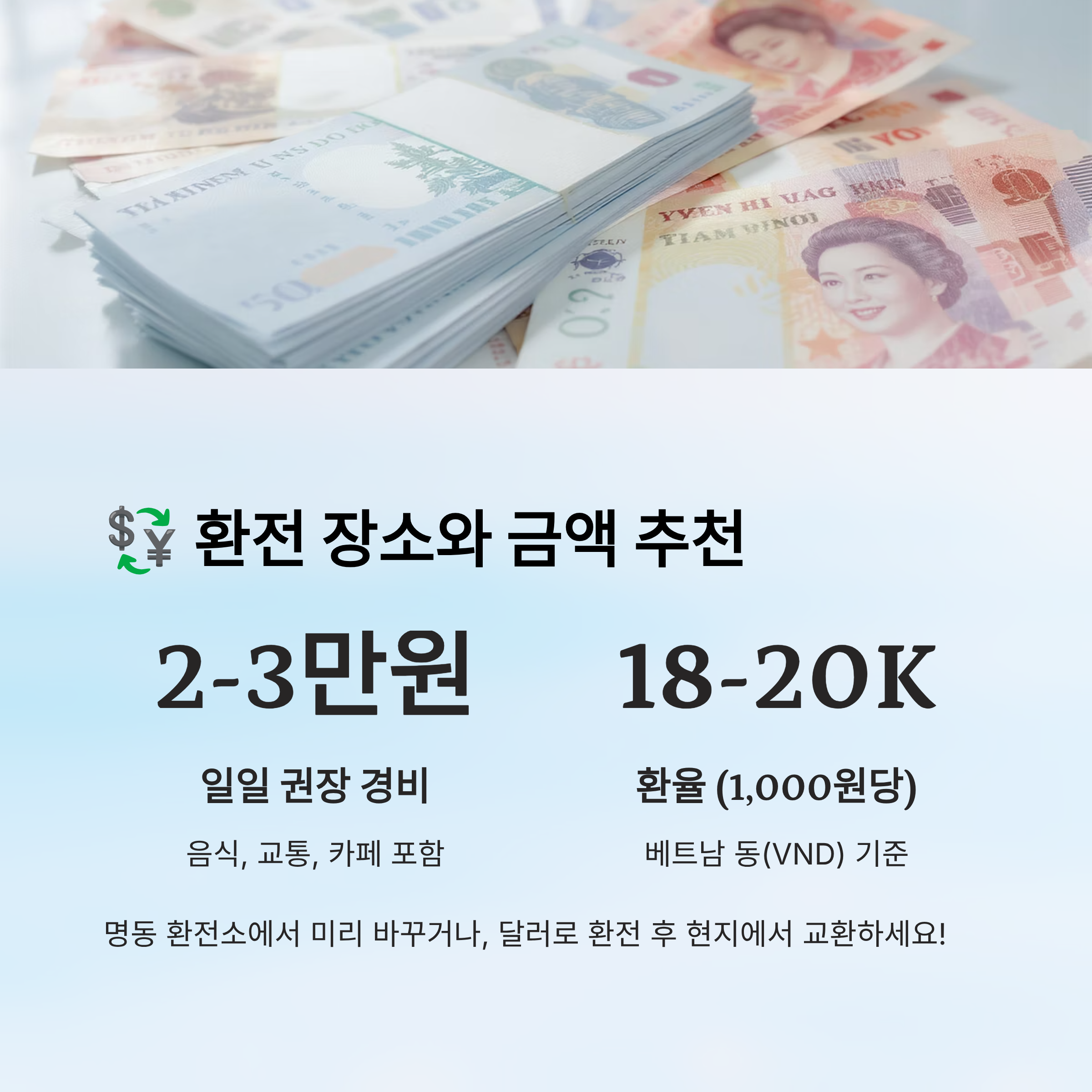 환전은 출국 전에 **한국에서 미리 일부만** 바꿔가는 걸 추천해요. 인천공항 환전소는 수수료가 높기 때문에, 시내 은행 또는 명동 환전소를 이용하면 훨씬 유리해요. 명동 환전소들은 베트남 동 환율도 좋고, 대기 시간도 짧은 편이에요.