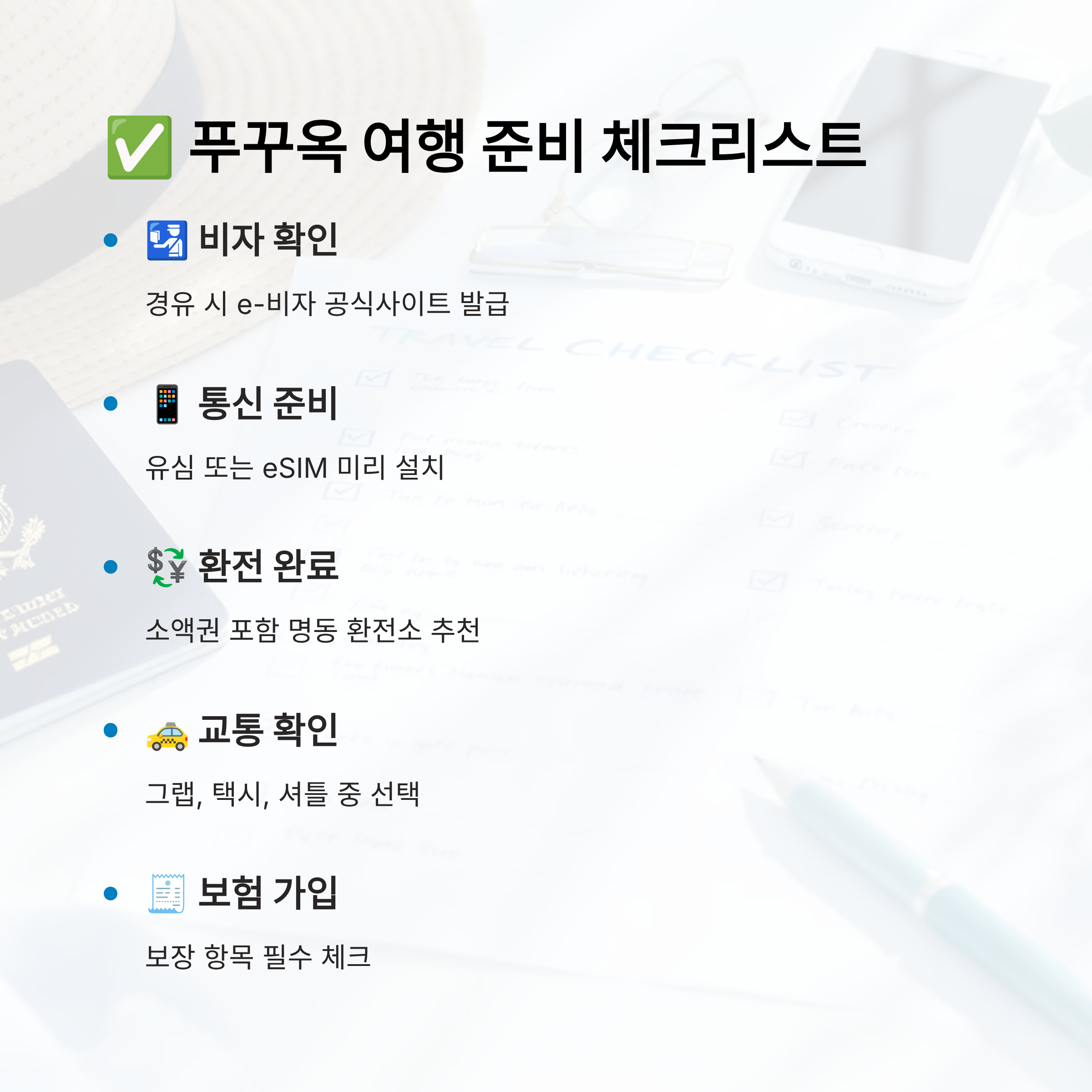 지금까지 푸꾸옥 자유여행을 위한 모든 정보를 하나씩 살펴봤어요. 이제 진짜로 떠날 준비를 마무리할 시간이에요! 😎 아래 체크리스트만 따라 하면, 중요한 걸 빠뜨릴 일 없이 완벽한 여행을 준비할 수 있어요.