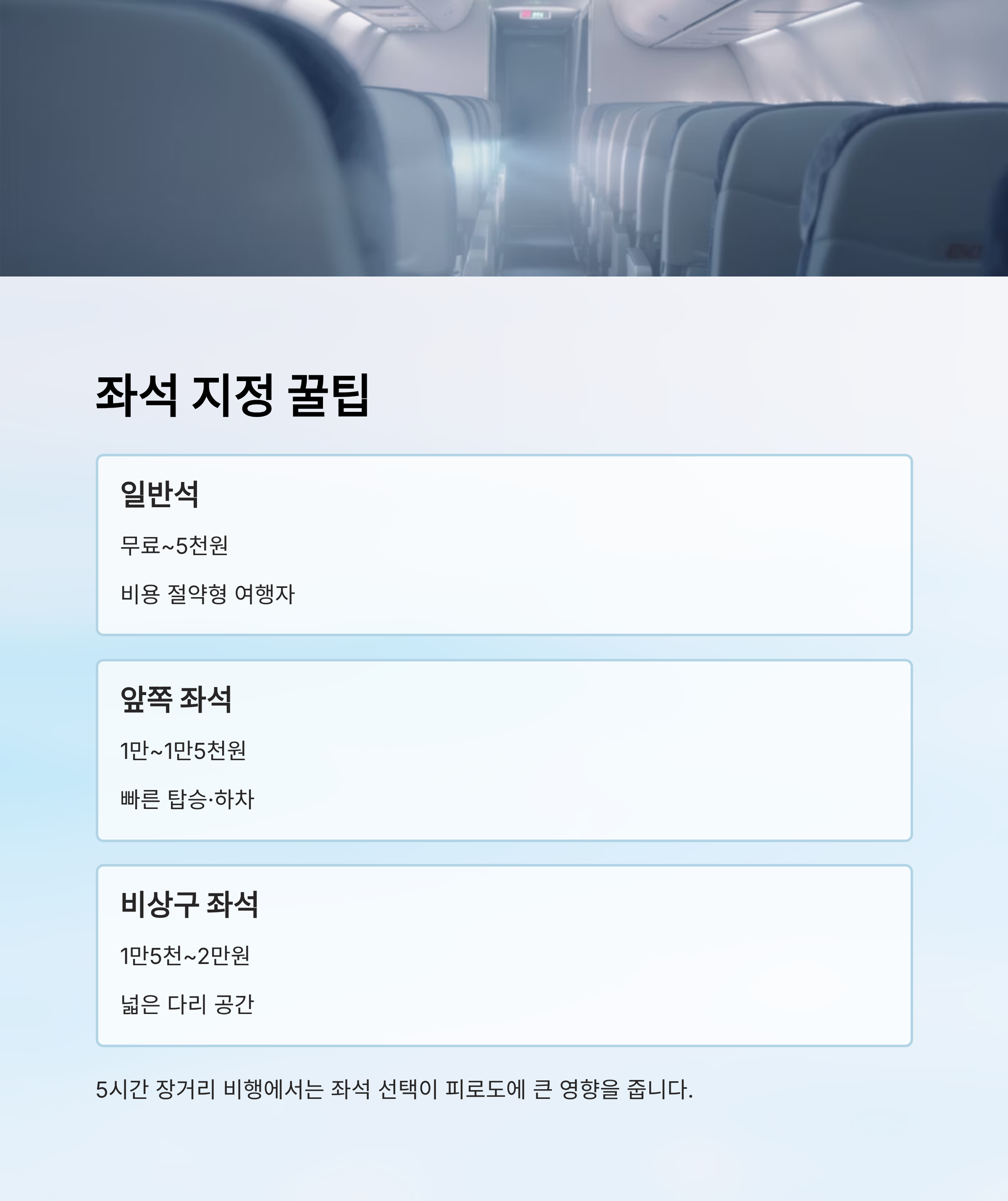 | 비상구 좌석 | 넓은 다리 공간 | 1만5천~2만 원 | 장시간 비행 선호자 |
