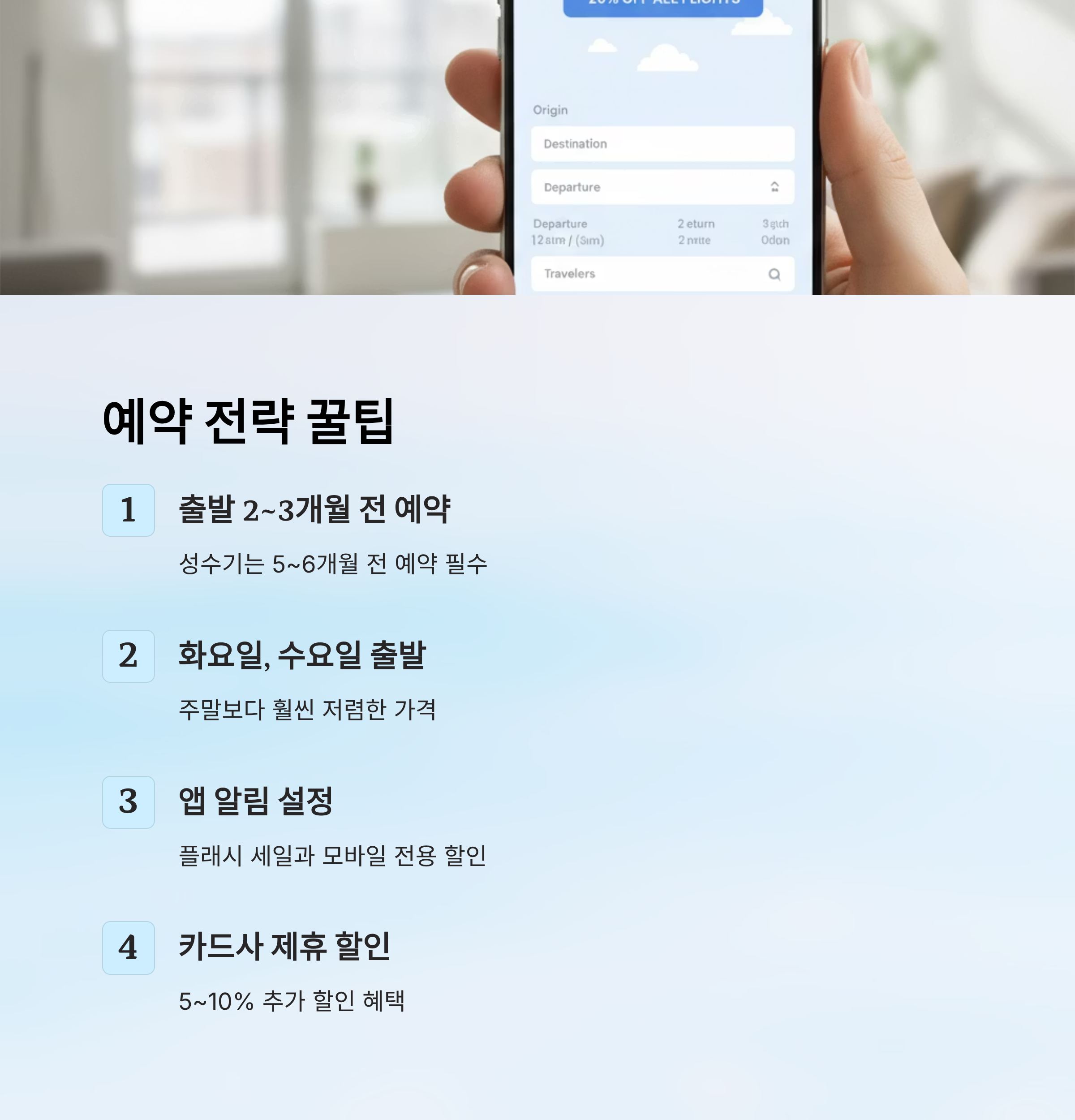 A1. 보통 출발 2~3개월 전에 진행되는 프로모션이나 플래시 세일을 노리는 게 가장 저렴해요. 앱 알림을 켜 두면 특가를 놓치지 않을 수 있어요. 📱