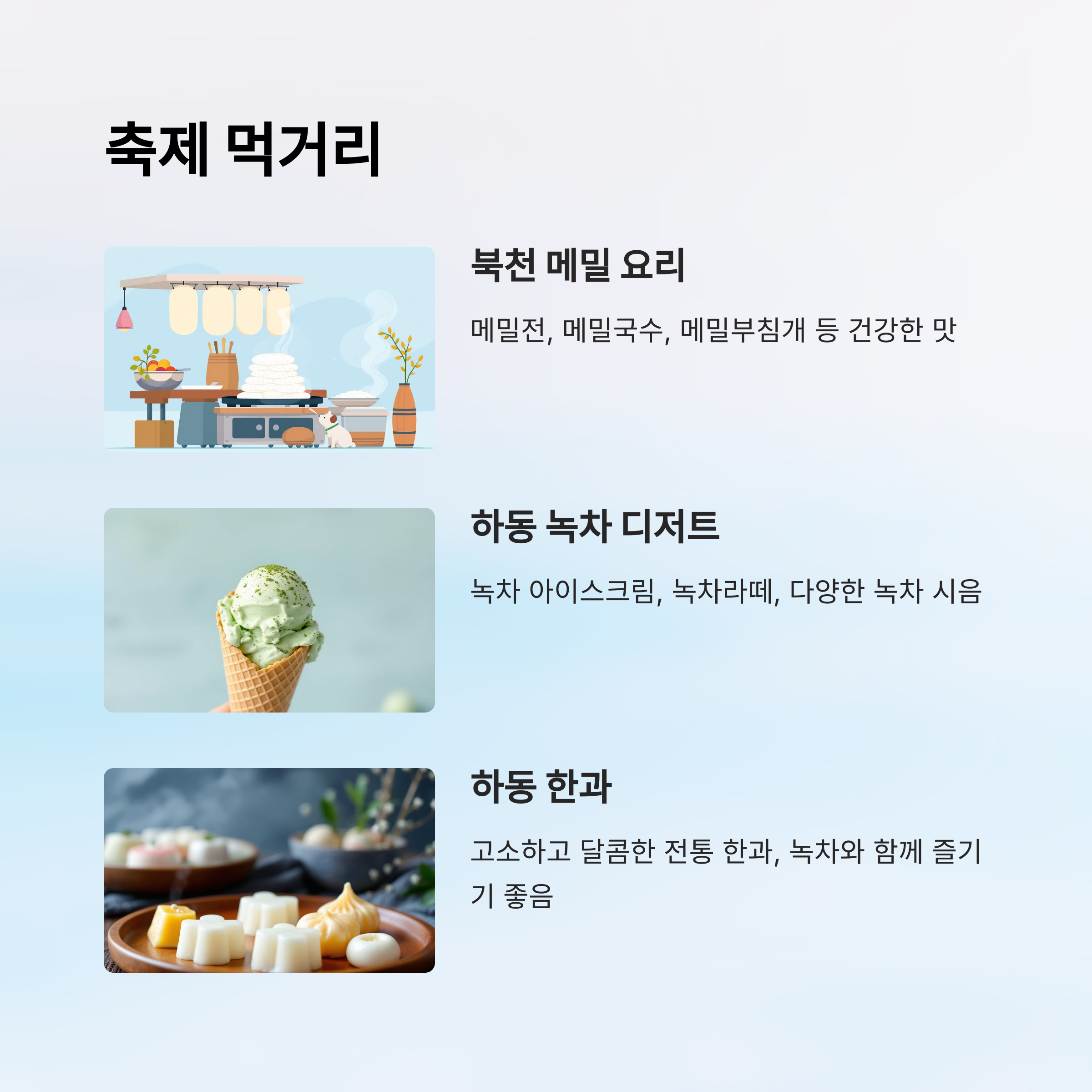 | 메밀전 | 북천 메밀 | 담백하고 고소한 맛 | 3,000~5,000원 | 어린이~어른 |