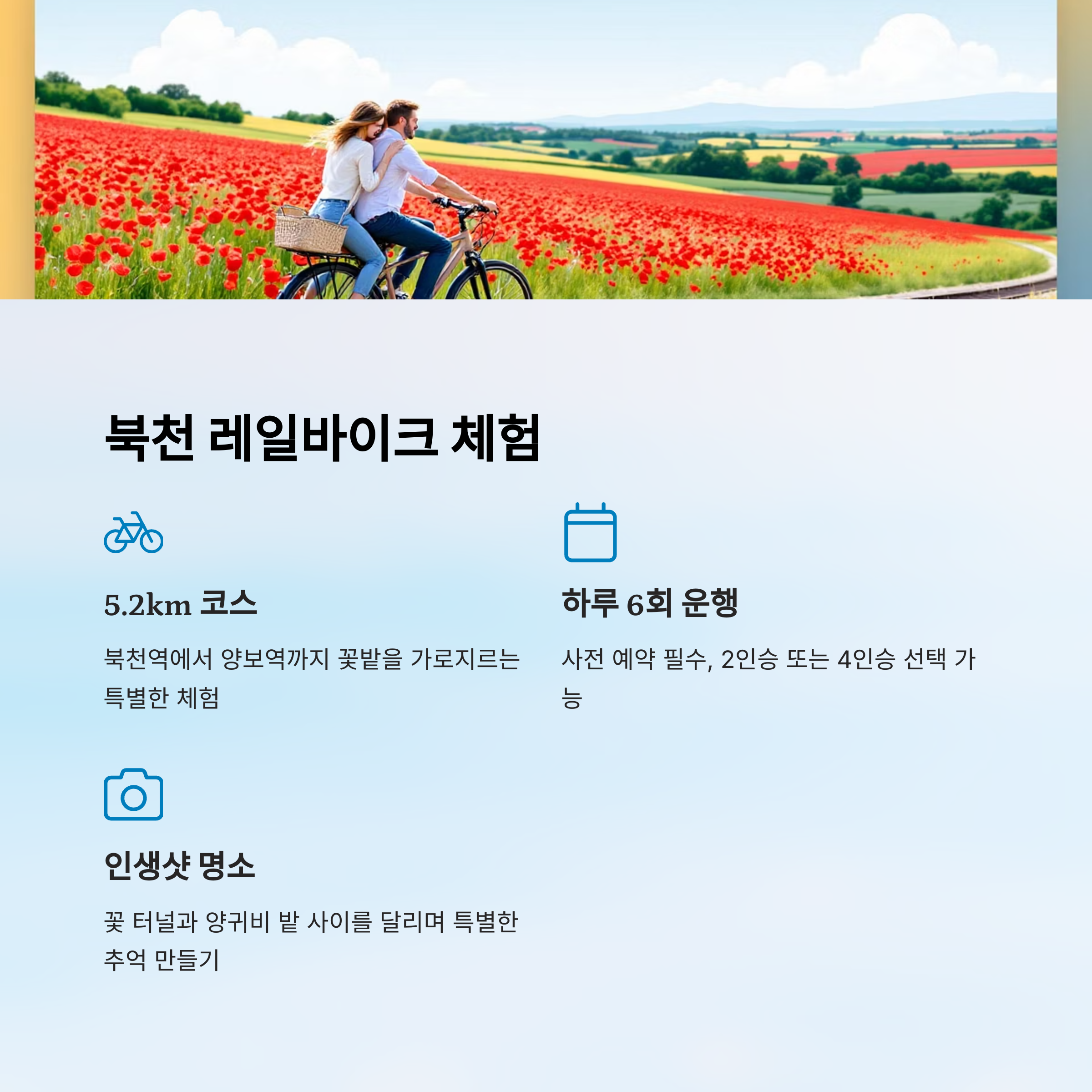 자전거를 타듯 페달을 밟으며 꽃길을 달리다 보면, 마치 동화 속 주인공이 된 것 같은 기분이 들어요. 특히 초여름 햇살과 산들바람을 맞으며 붉은 꽃양귀비 사이를 달리는 경험은 남녀노소 누구에게나 특별한 추억이 될 거예요.