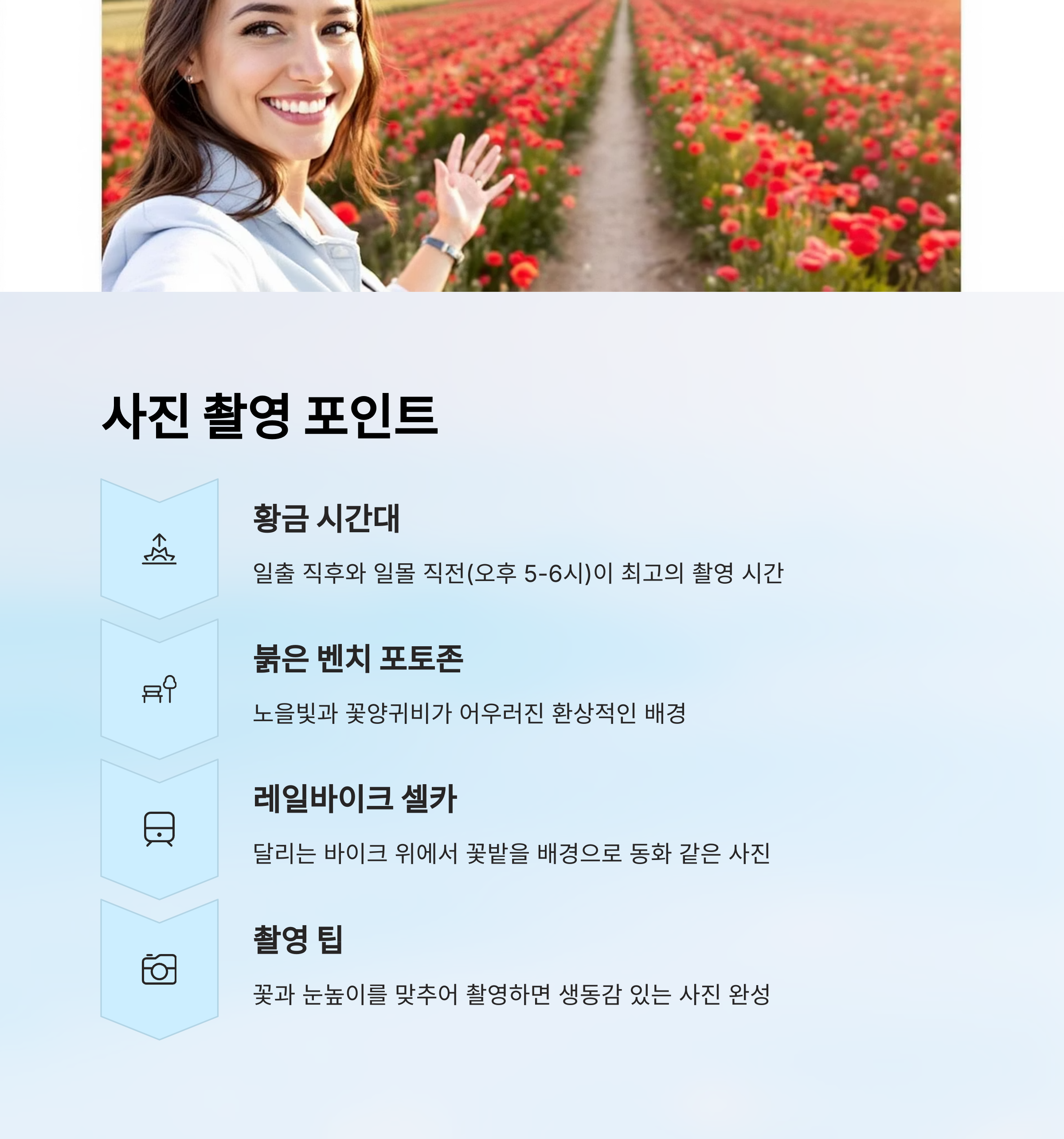 특히 오후 5시~6시 무렵에는 햇빛이 낮게 떨어지면서 붉은 꽃과 붉은 하늘이 어우러져 황홀한 장면이 펼쳐져요. 이 시간대에 맞춰 꽃밭 중간의 붉은 벤치 포토존이나 꽃터널 구간에서 촬영하면 최고의 결과물을 얻을 수 있어요.