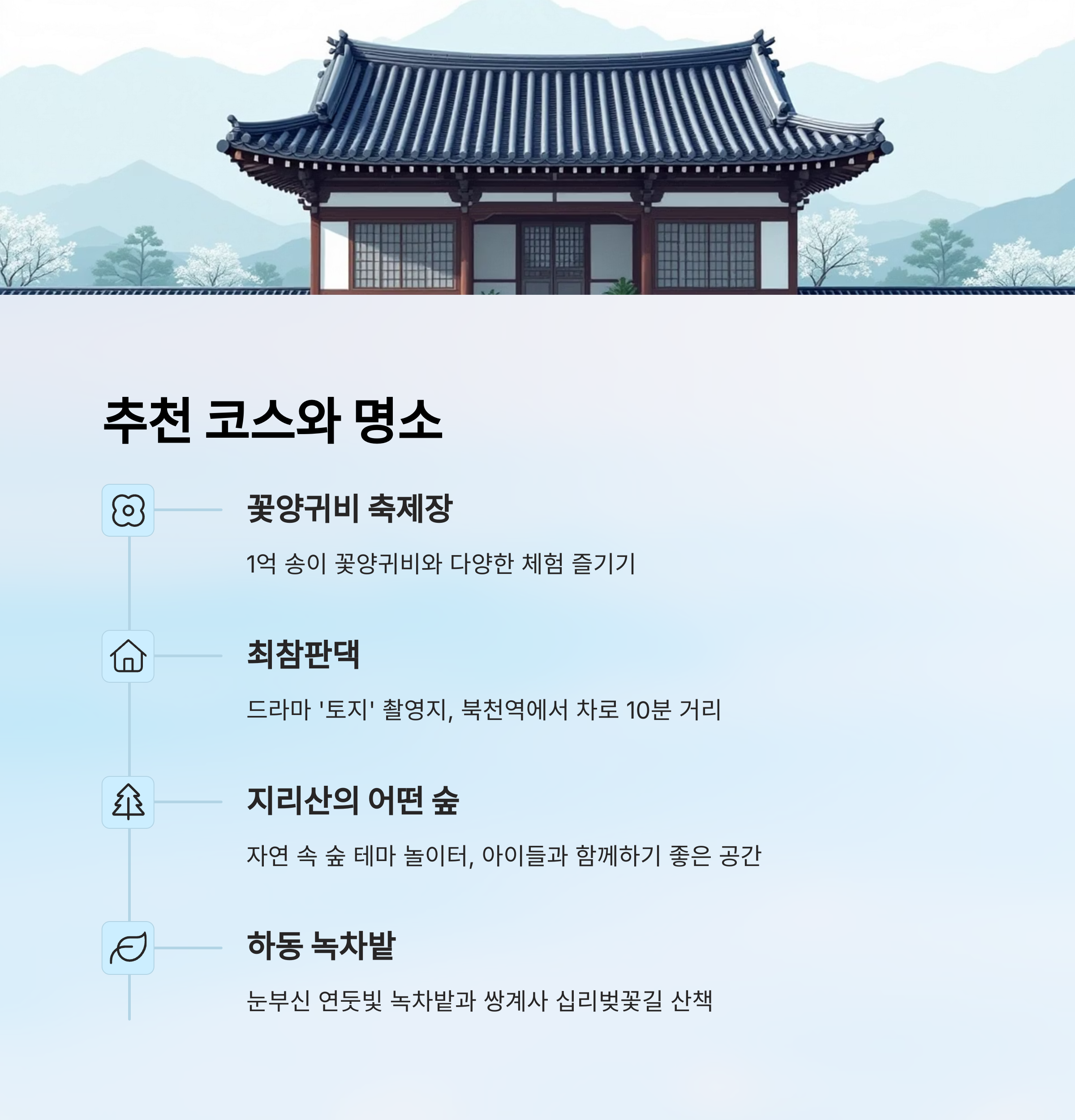 축제와 연계된 관광지를 함께 둘러보면 하루 일정이 정말 알차게 느껴질 거예요. 하동은 봄꽃의 향기뿐만 아니라 사람 냄새 나는 정겨운 마을의 매력까지 함께 간직한 곳이랍니다. 🌿