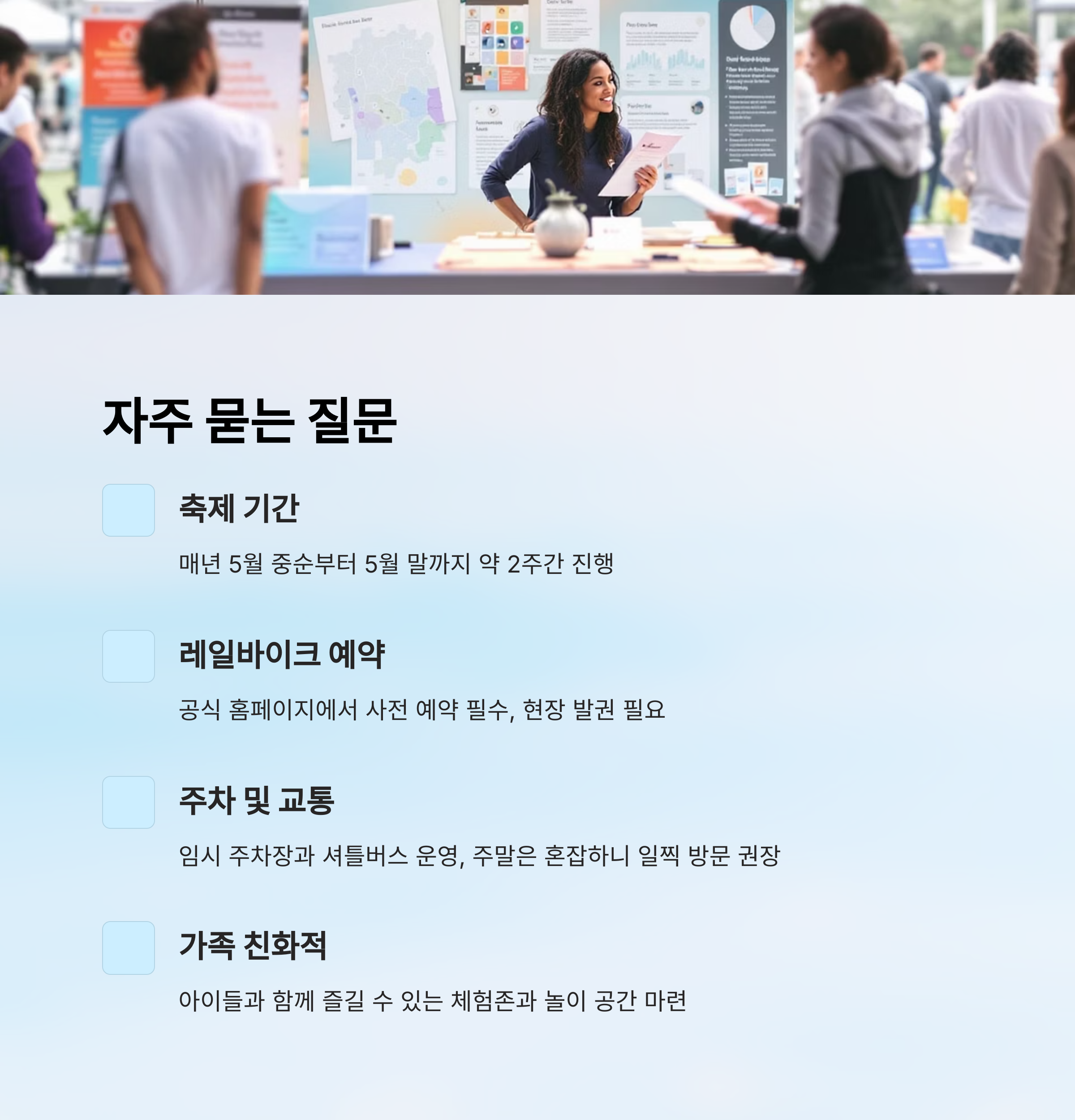A3. 축제장 인근에는 임시 주차장이 마련되어 있으며, 셔틀버스도 운행돼요. 주말에는 혼잡하니 가급적 오전 일찍 도착하는 걸 추천해요.
