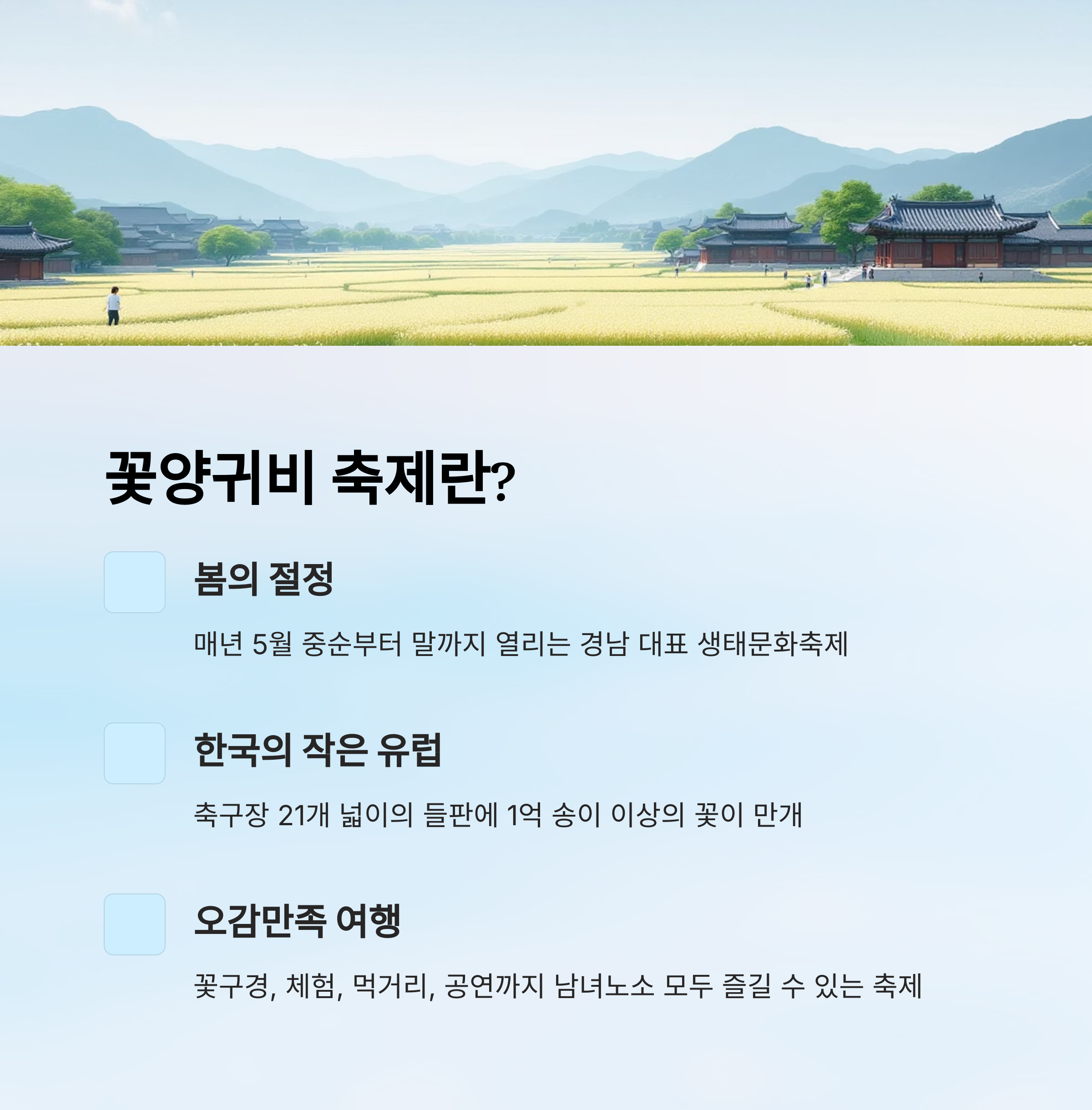 광활한 꽃밭에 핀 1억 송이의 꽃양귀비와 수레국화, 금영화 등 형형색색의 꽃들은 그야말로 한 폭의 그림 같아요. 여기에 북천역에서 시작되는 레일바이크 체험, 한옥 고택 탐방, 숲 테마 놀이터까지! 아이들과 어른 모두가 만족할 만한 체험 코스가 가득하답니다.