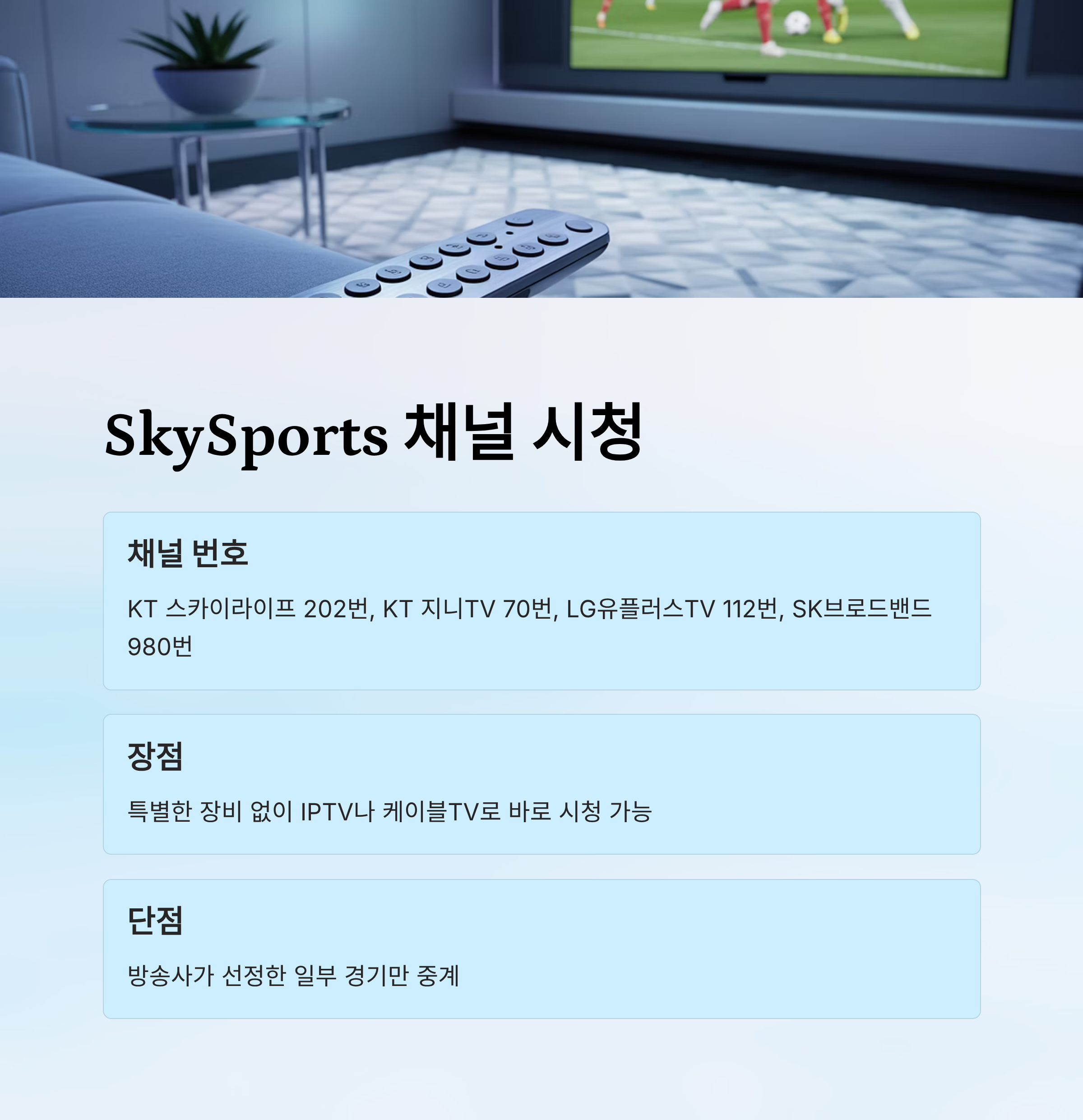 | SkySports | ❌ | ⭕ | IPTV 요금제 포함 | 인기 경기 위주 |