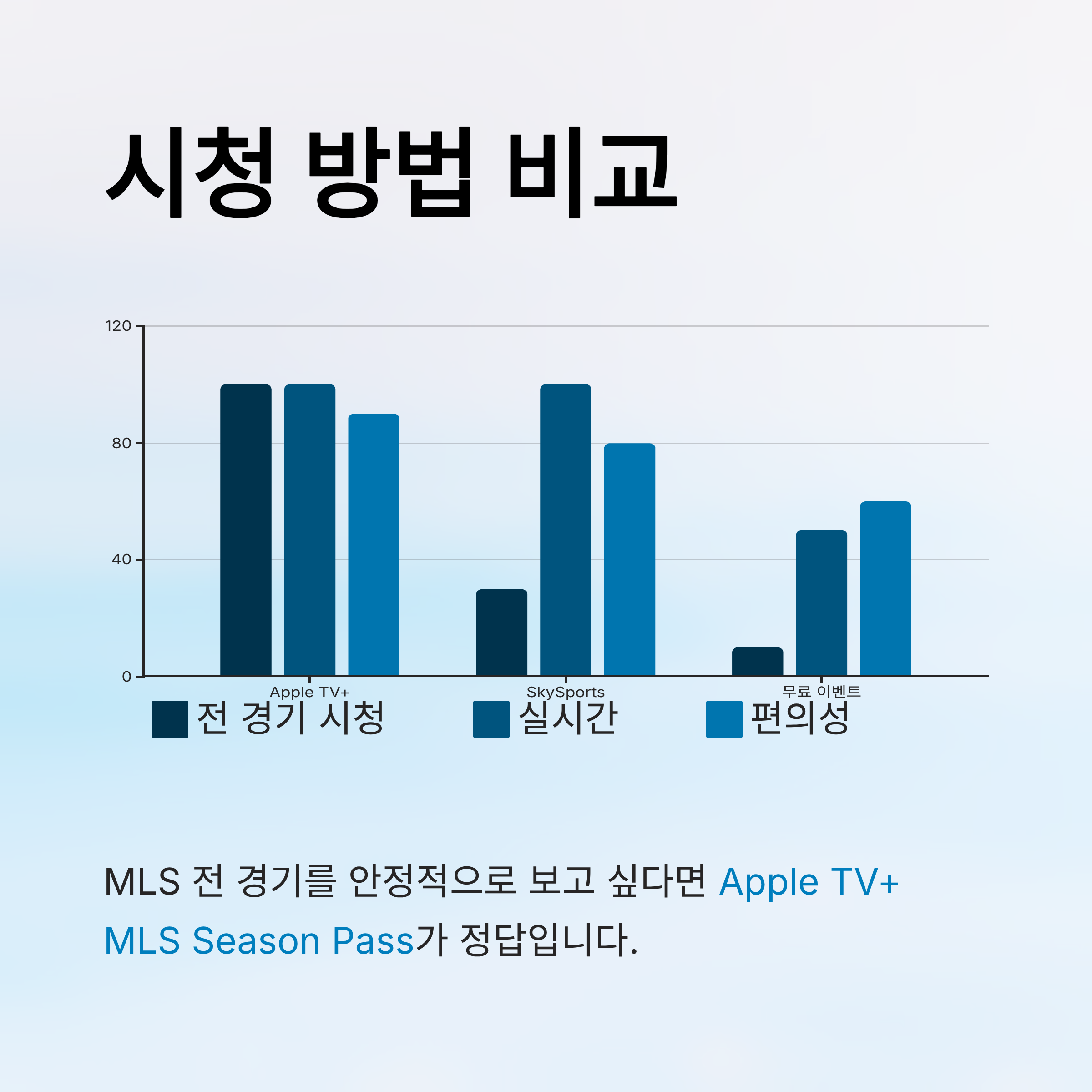 결론: MLS 전 경기를 안정적으로 보고 싶다면 Apple TV+ MLS Season Pass가 정답입니다. 다만 예산이나 시간에 따라 SkySports·무료 이벤트·EA SPORTS FC Mobile을 병행하면 더 경제적으로 즐길 수 있습니다.