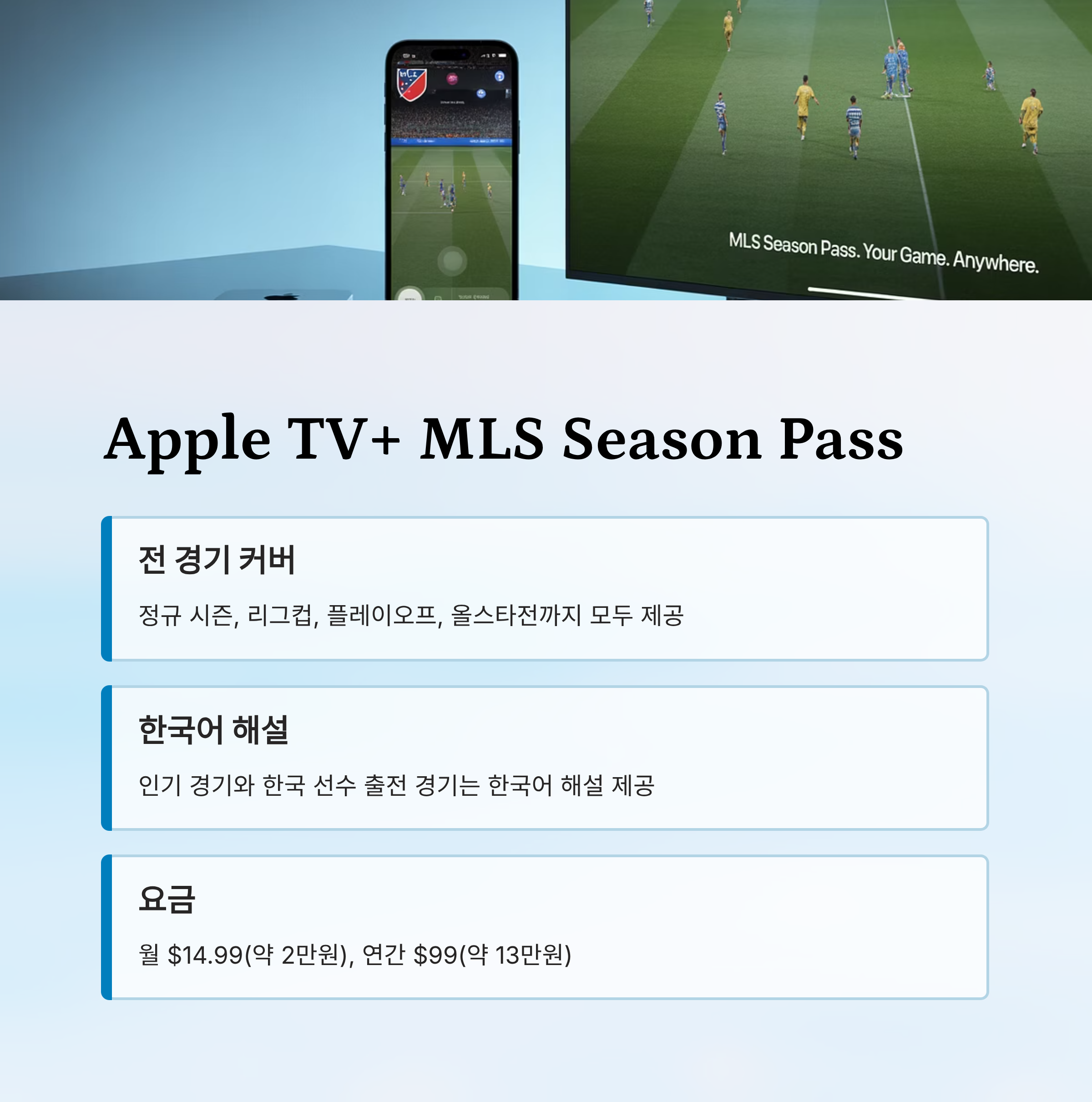 | Apple TV+ MLS Season Pass | ⭕ | ⭕ | 월 2만 원 / 연 13만 원 | 전 경기·합법·고화질 |