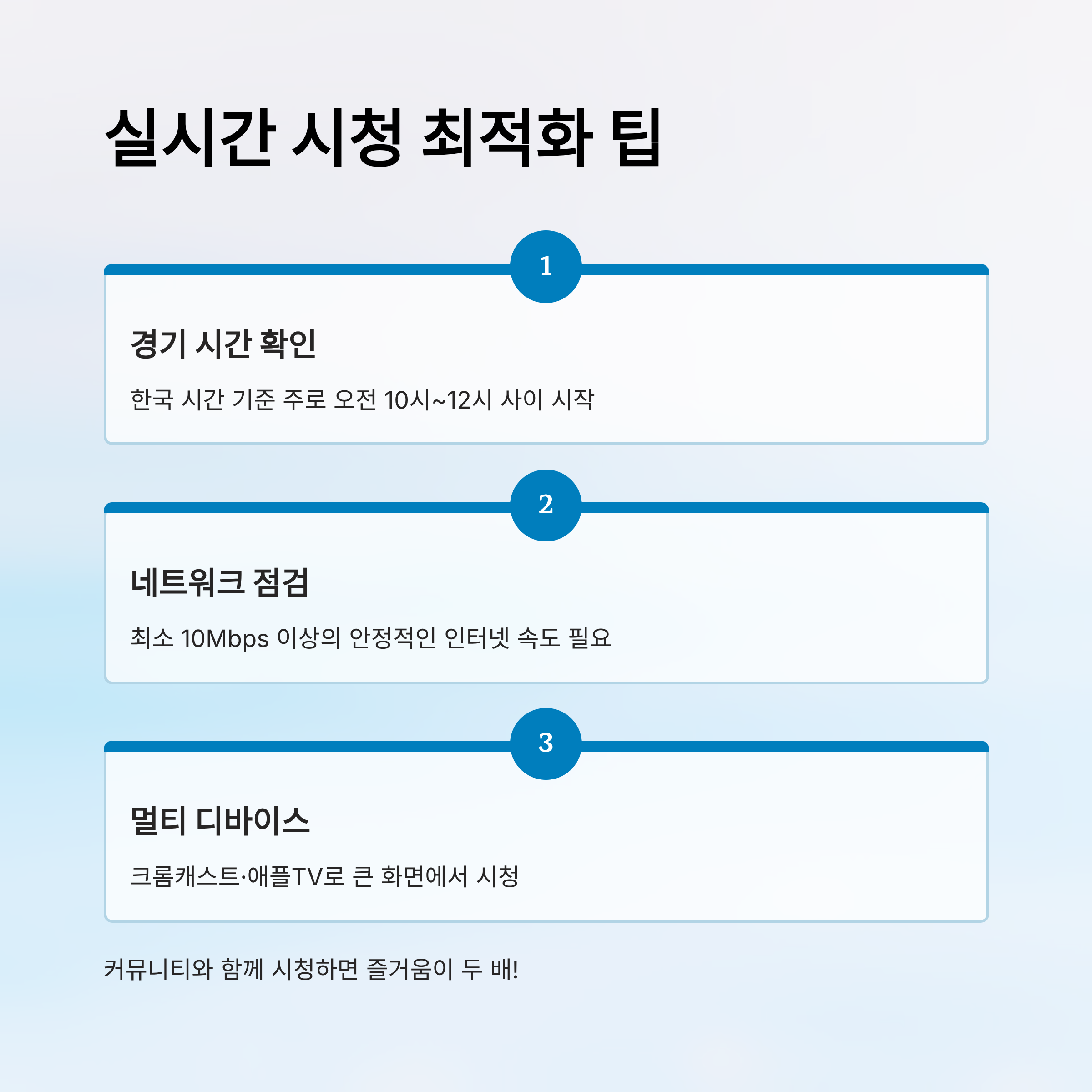 실시간 스트리밍은 최소 10Mbps 이상의 안정적인 인터넷 속도가 필요해요. 가능하다면 유선 LAN 연결을 사용하거나, 와이파이 공유기를 경기 시작 전에 재부팅해서 끊김 없는 시청 환경을 만들어요.