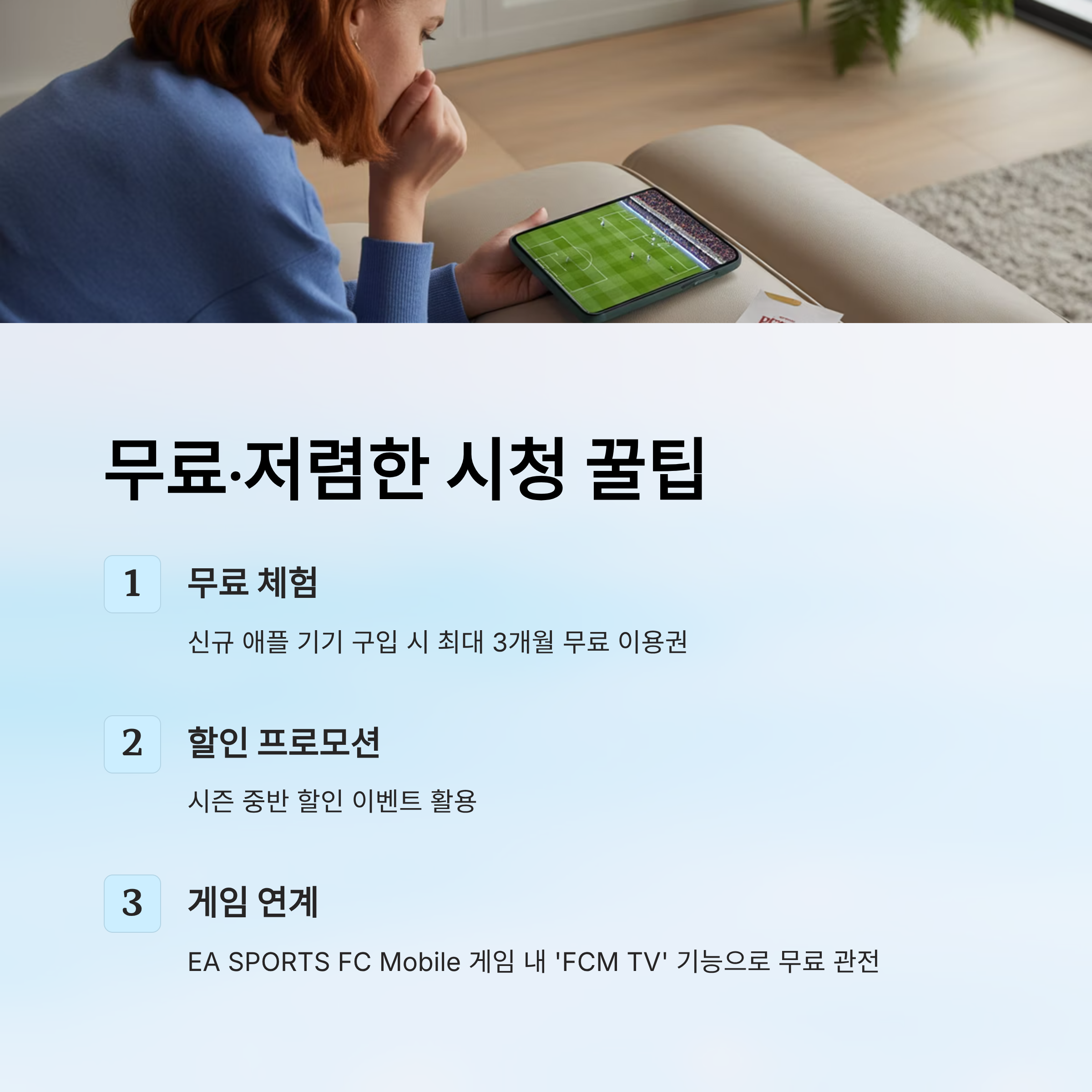 A. 신규 애플 기기 구입 시 무료 체험 혜택, 시즌 중 할인 이벤트, 일부 경기 무료 공개 등을 활용하면 가능합니다.